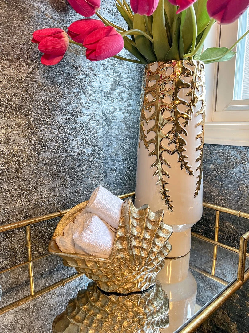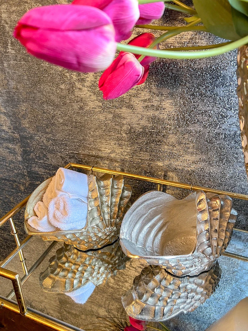 Description: This gorgeous metal decorative shell will look perfect in your bathroom filled with towels or use it anywhere for your storage needs!