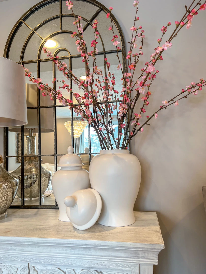 Description: This tall branch stem features stunning plum blossoms. These are perfect to style in your tall vases and ginger jars all over your home.