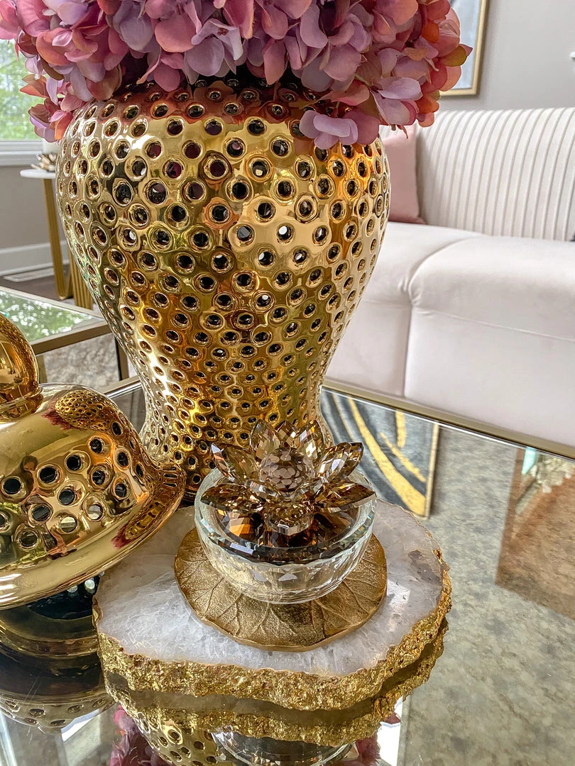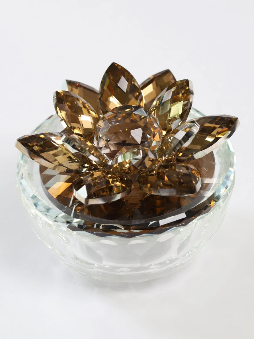 This amber crystal flower box can be stunning decor on its own or can be used to glamorously store items in the bathroom, kitchen, living room, office, etc!