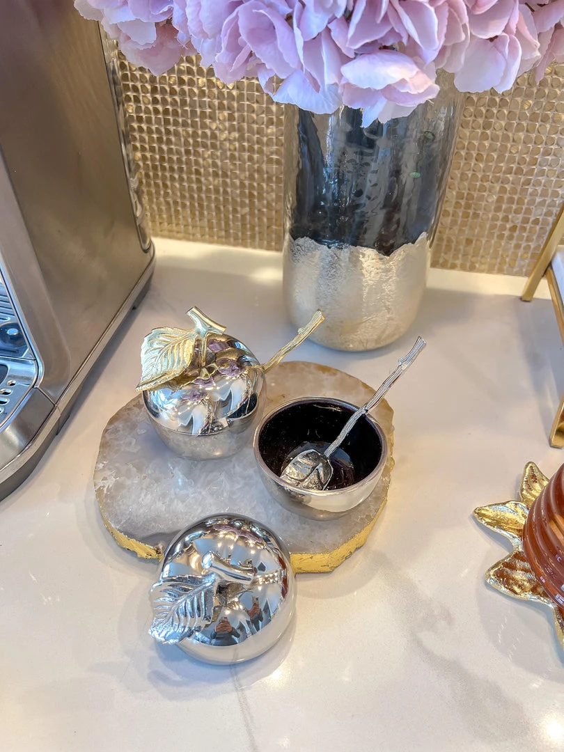 Description: This is the cutest little apple-shaped jar with a branch handled leaf spoon. Use for holding sugar or spices. Available in Silver and Gold and Silver. Individually priced.