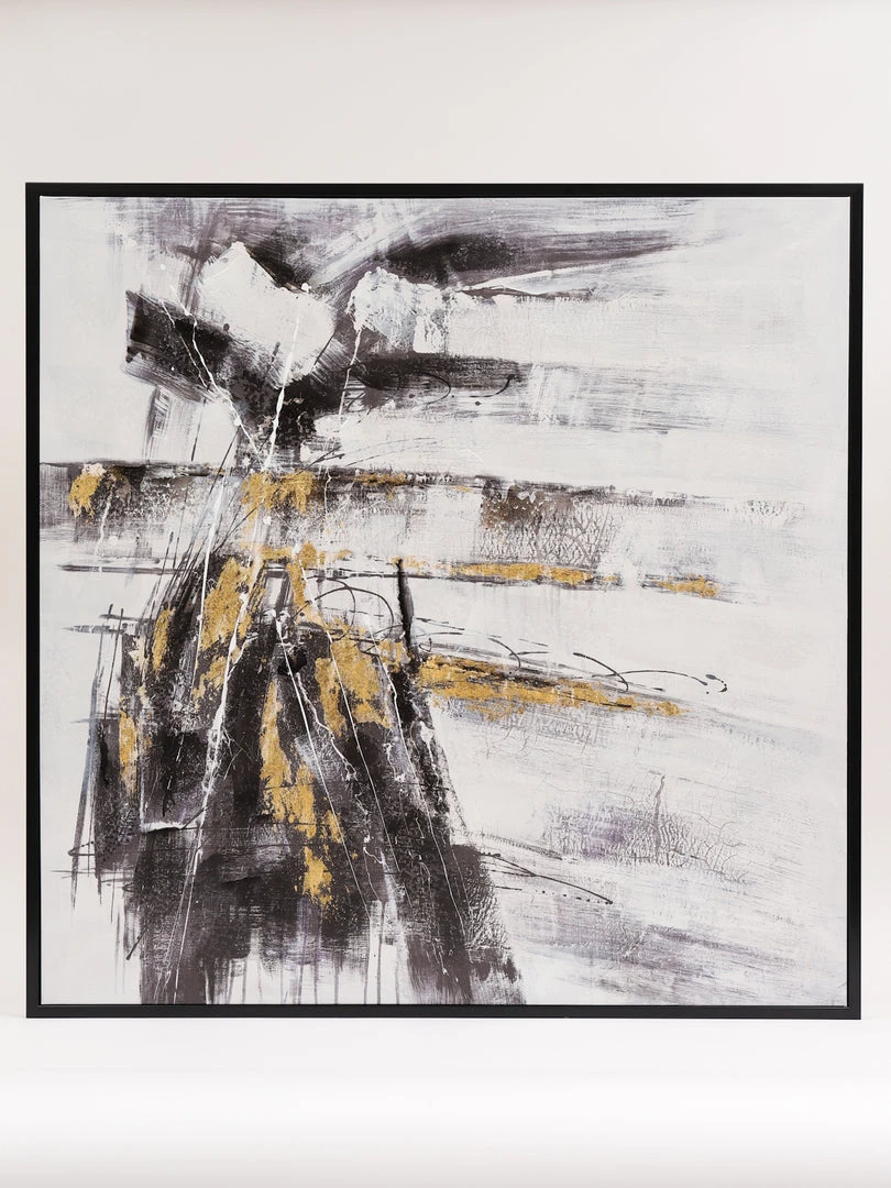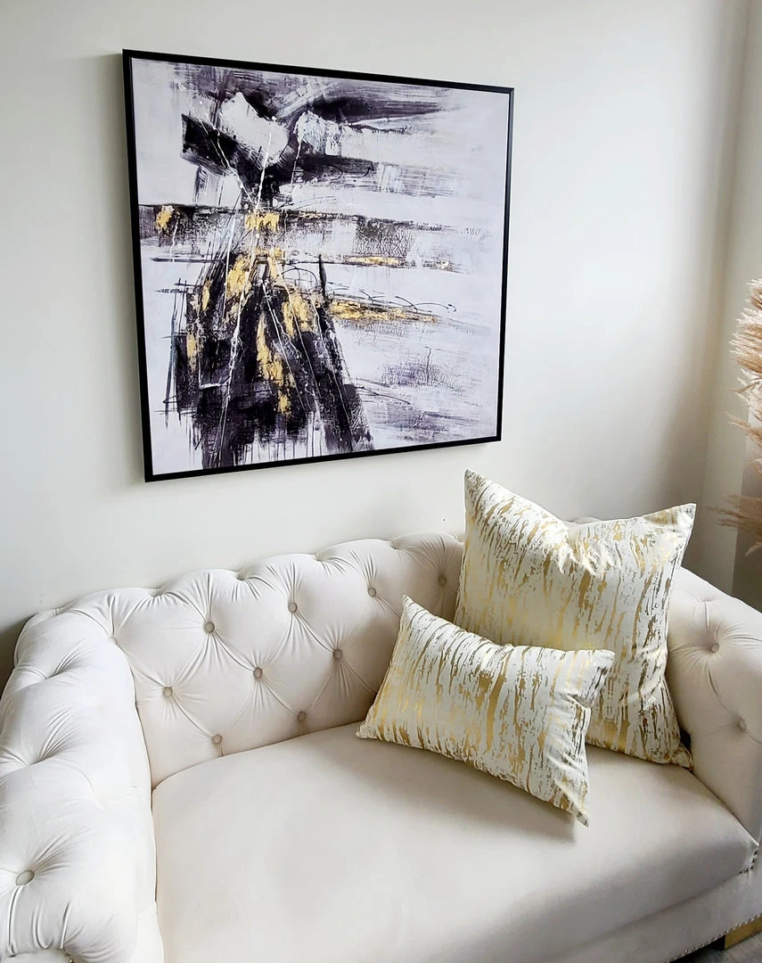 Description: This moody abstract canvas features blacks, grey, and golds! It brings drama and glam to your room!
