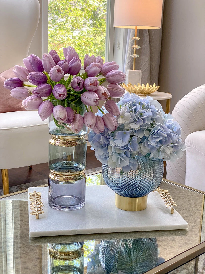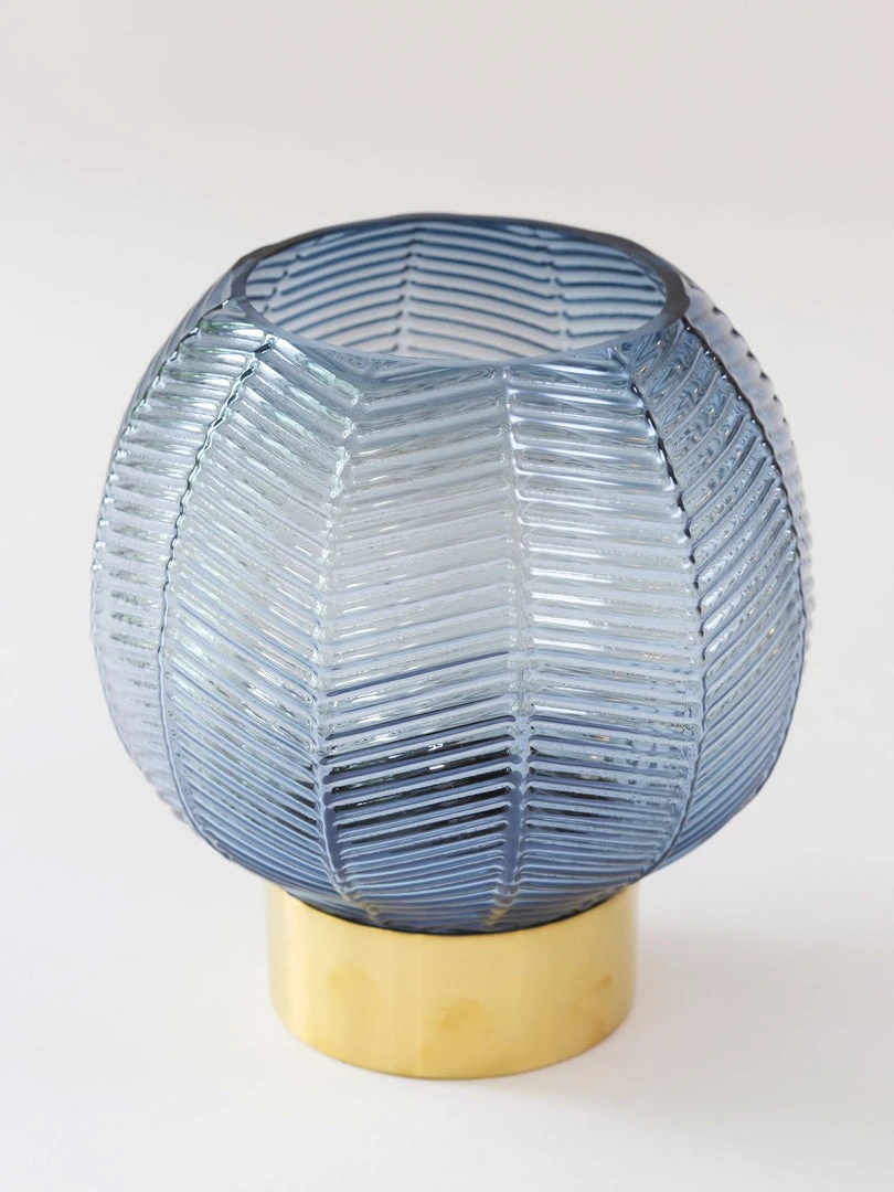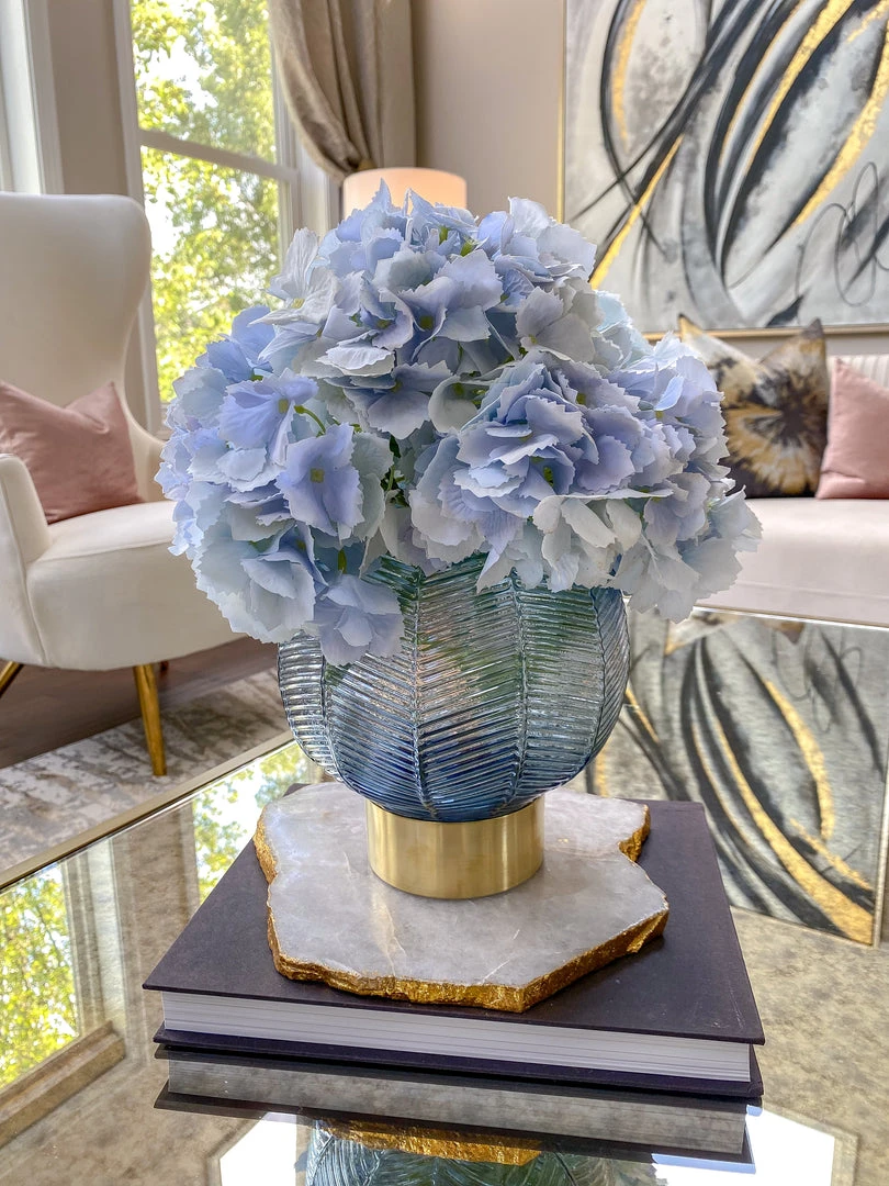 Description: This blue round vases offers the perfect pop of color for any space. The blue is subtle enough to blend in with any room, and features a gold base to add to the elegance!