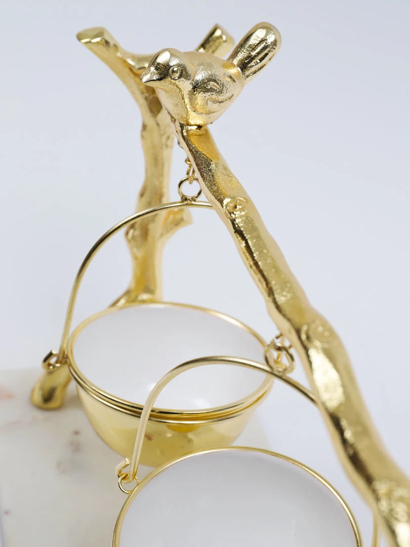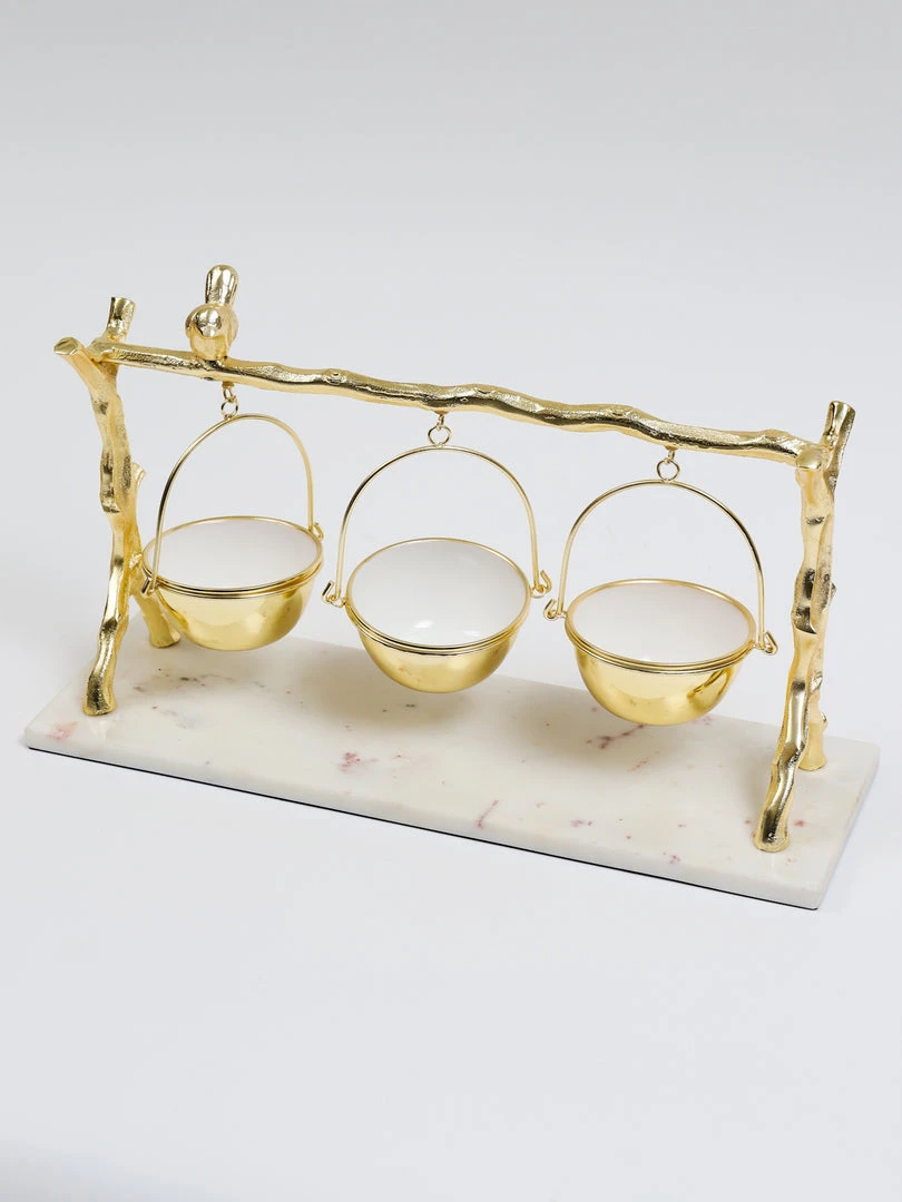 Description: This marble serving tray has three hanging bowls and is detailed with gold branches and a golden bird perched on top! This is one stunning piece!