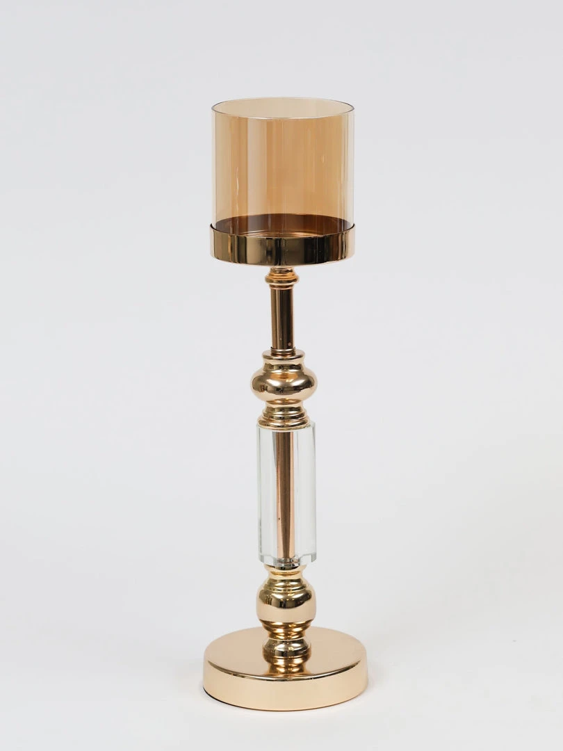 Description: These candle sticks are absolutely beautiful! We love the classic design with a modern twist, and the amber glass hurricane glass completes the look! Sold as a set of 3.