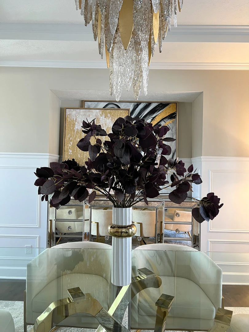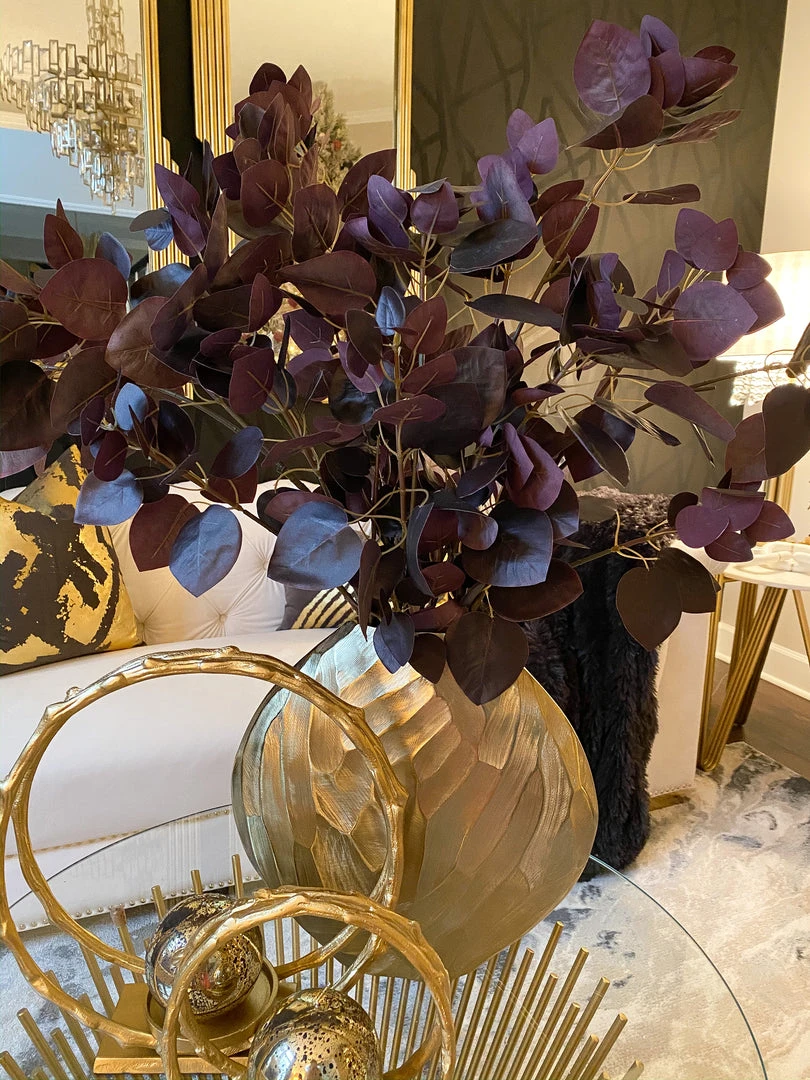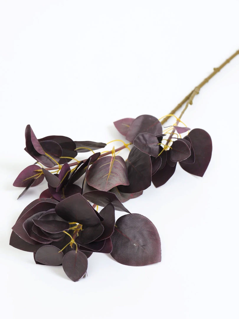 This stunning faux eucalyptus stem is a beautiful addition to any vase. The deep burgundy color brings depth to your room and is perfect for any season! The flat leaves bring texture to your decor.