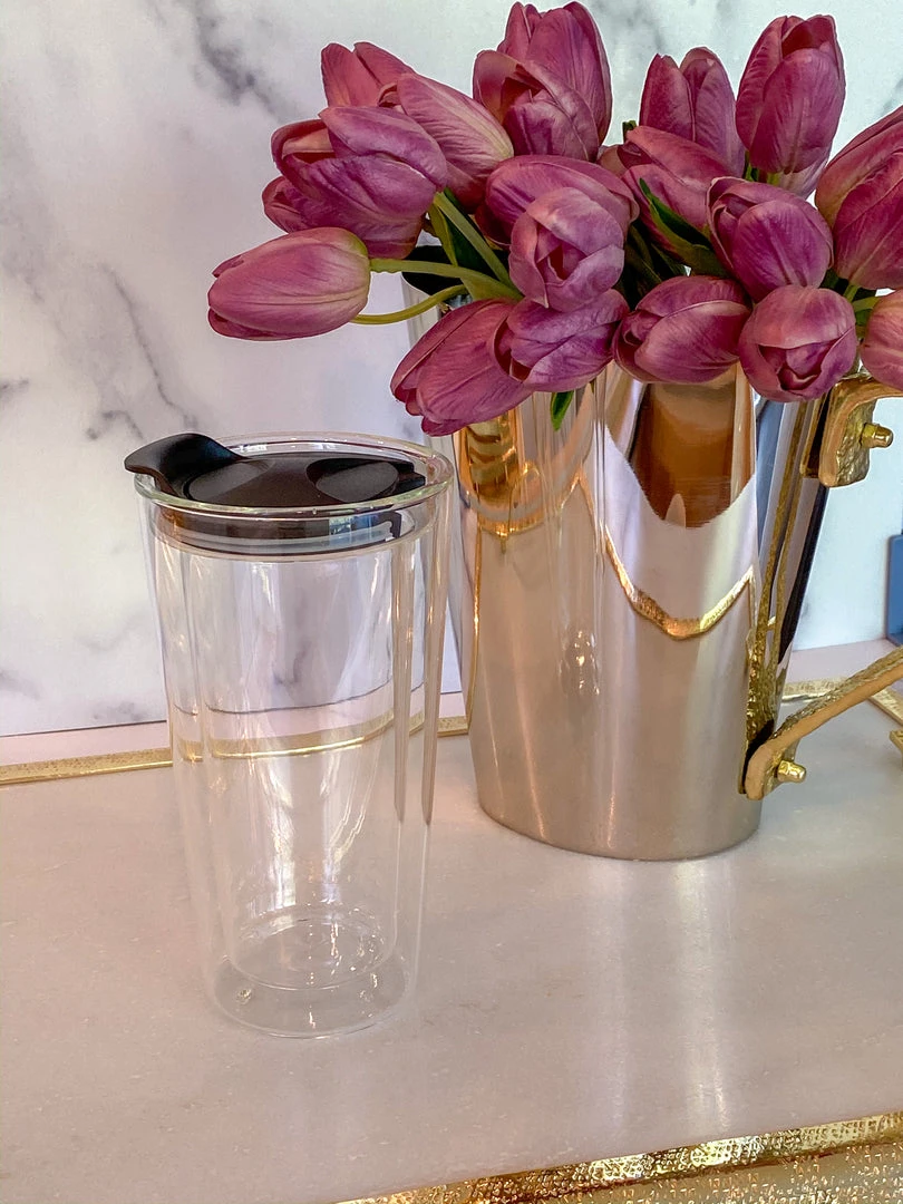 This glass mug is a stylish way to drink your morning coffee or tea!