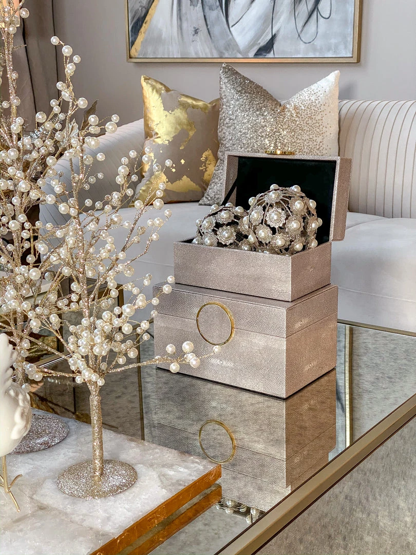 This beige rectangular box set is beautifully patterned with a faux leather overlay. The gold medallion on the front ties these back to all of your gold decor. Can be styled together, or separately, and they are great for storing things like remotes and other items.