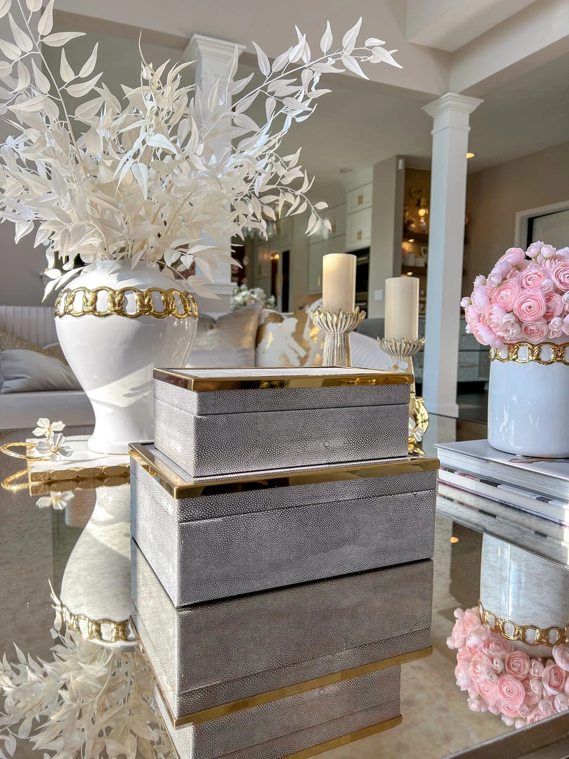 This black and gray rectangular box set is beautifully patterned with a faux leather overlay and an abstract pattern. The gold medallion on the front ties these back to all of your gold decor. Can be styled together, or separately, and they are great for storing things like remotes and other items.