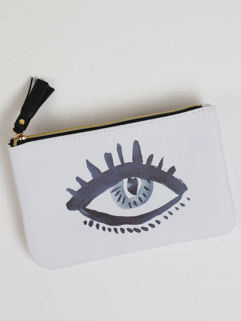 Description: This stylish evil eye pouch is the perfect accessory for travel or makeup storage! The Faux leather finish offers an elegant style, and the look is complete with a gold metal zipper and black tassel charm.