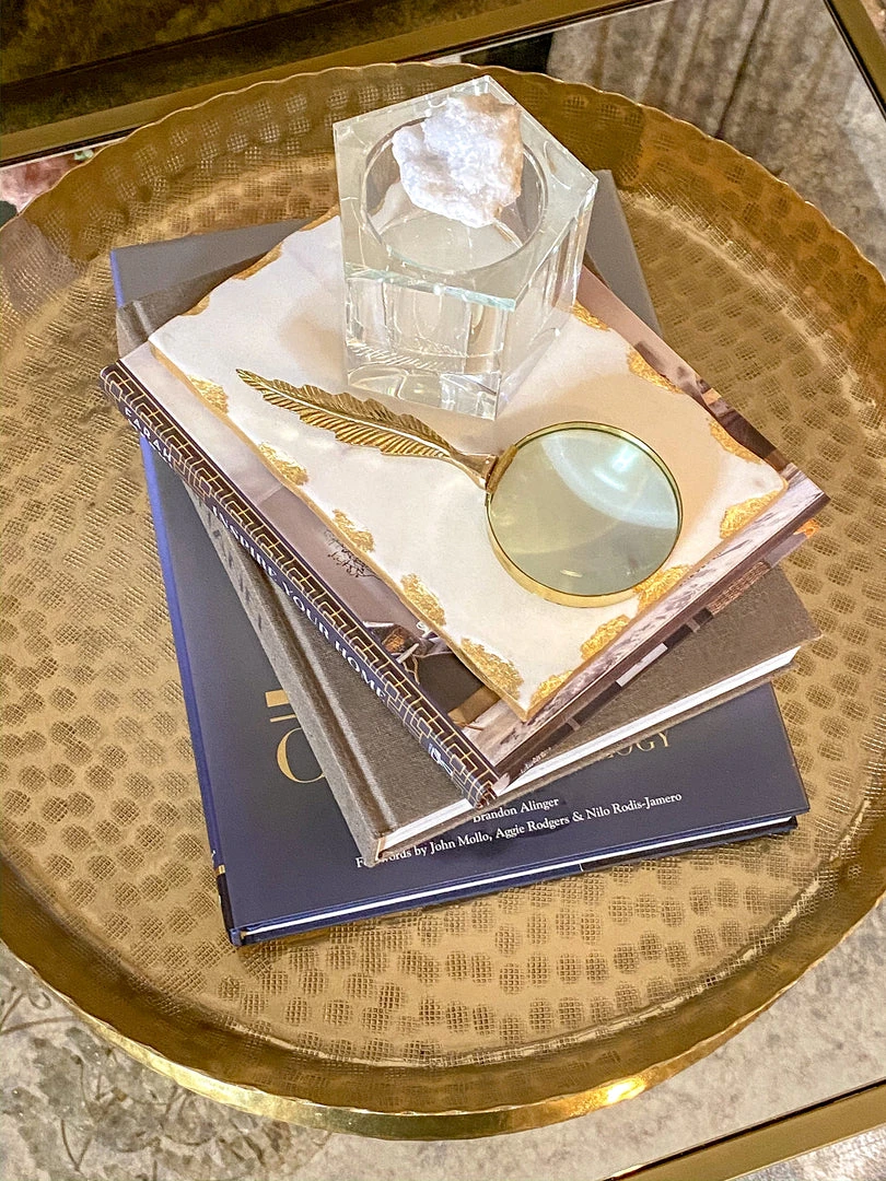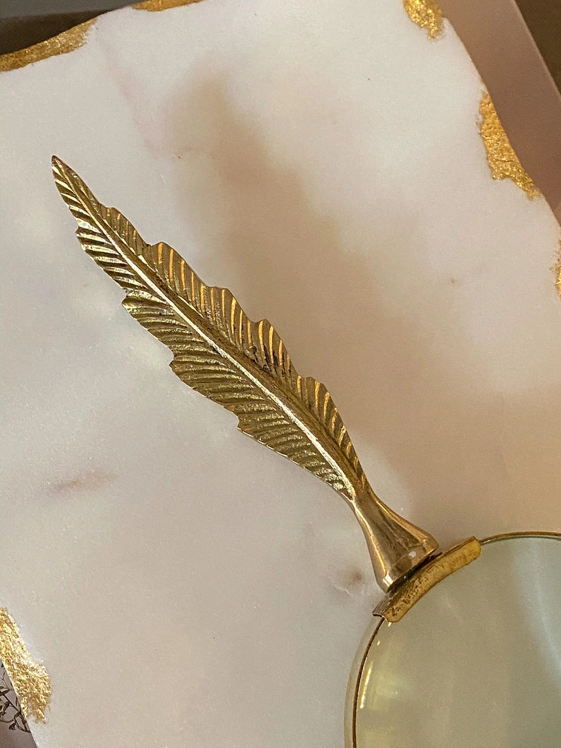 Description: This gold, feather magnifying glass adds glamour to your display.