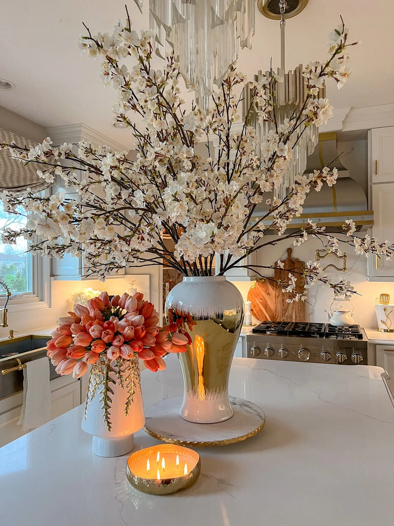Description: This cherry blossom stem is the perfect accent for your home all year round! This stem is quite substantial and tall. Perfect for a tall vase in an entryway and can be used all year round!