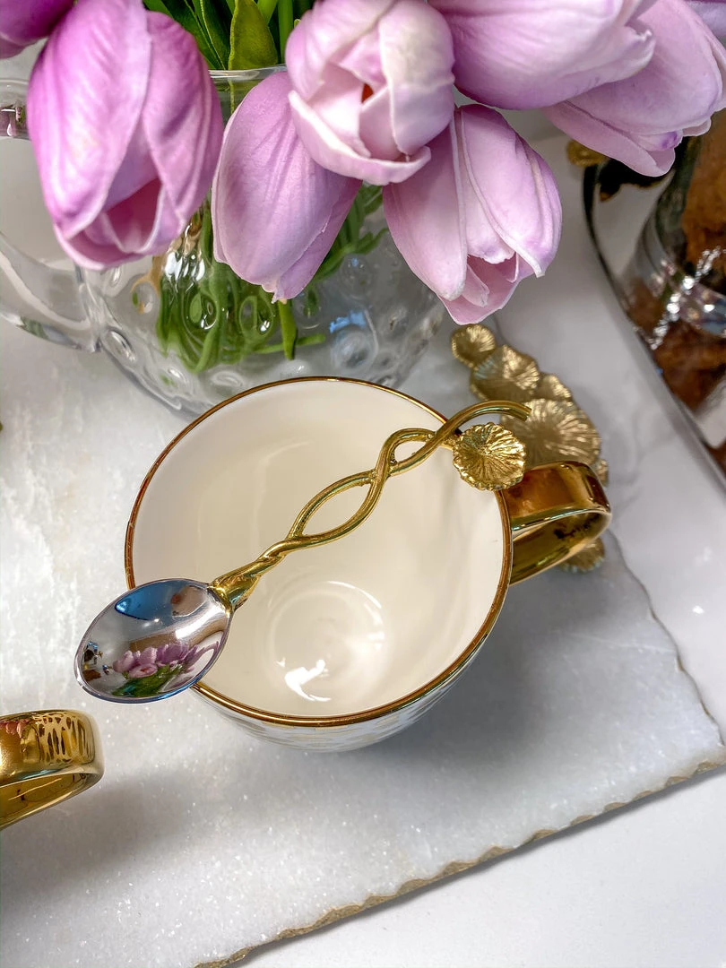 Description: These spoons are absolutely beautiful! We love the natural glam with the floral end piece, and the stylish detail of a twisted handle. Sold as a set 4.