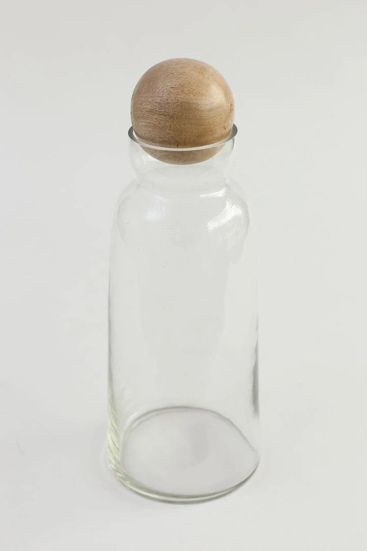 Description: This elegant glass decanter is simple and stylish piece! Topped with a mango wood stopper, this is a simple way to add some rustic charm to a glamorous room.