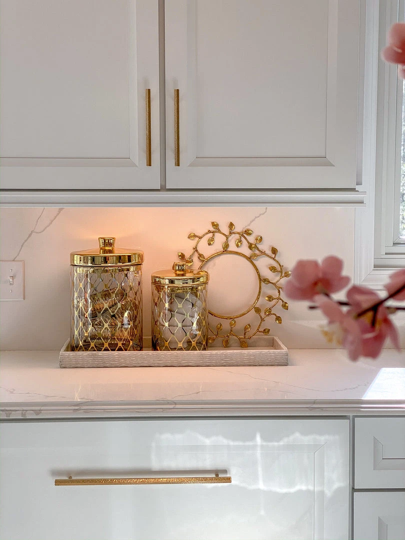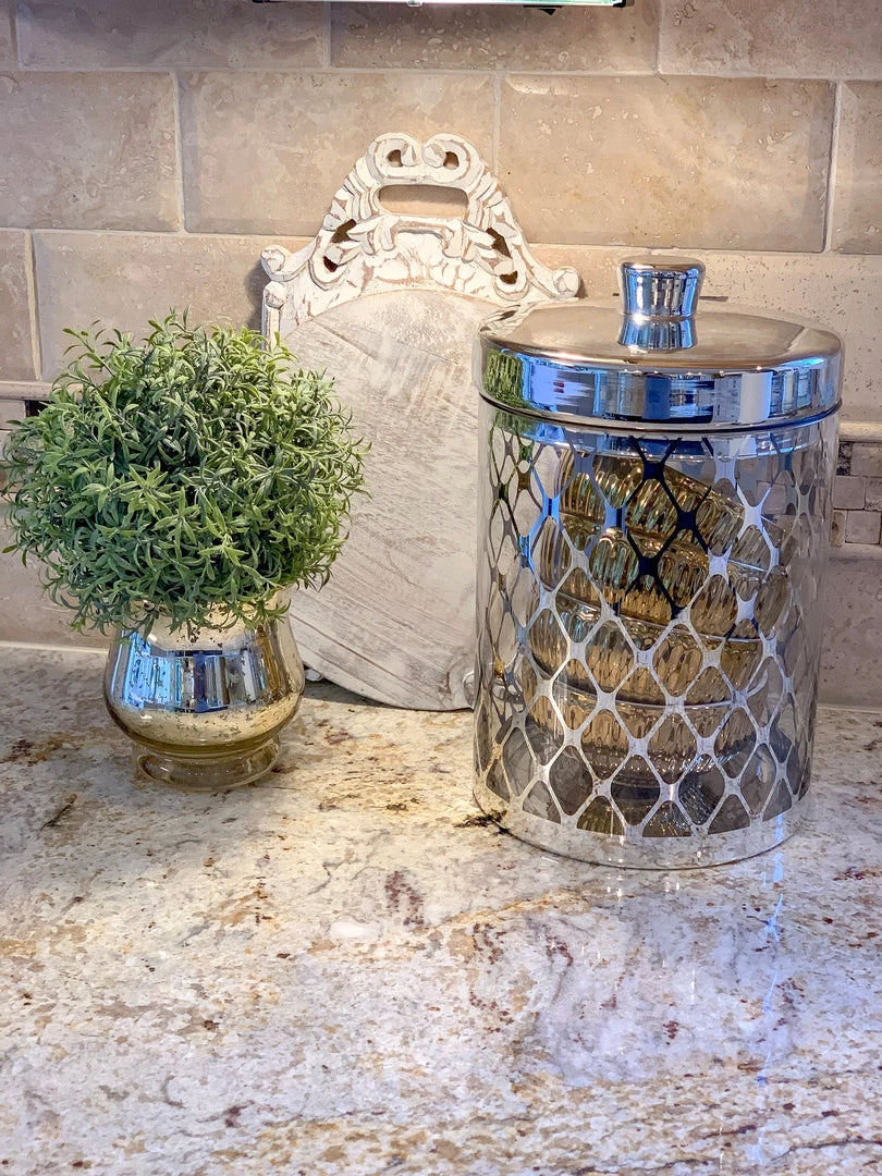 In Gold and in Silver, these glass jars are a classy touch to any countertop!