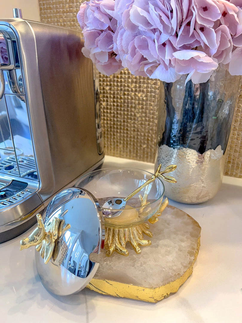 Description: This glass jar sits atop a golden branch base and the silver metal lid has the cutest little golden bird. This gorgeous piece is perfect for holding sugar, honey or jam.