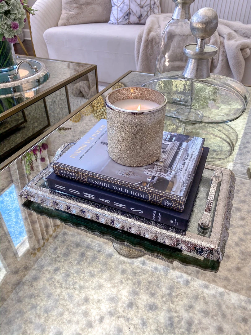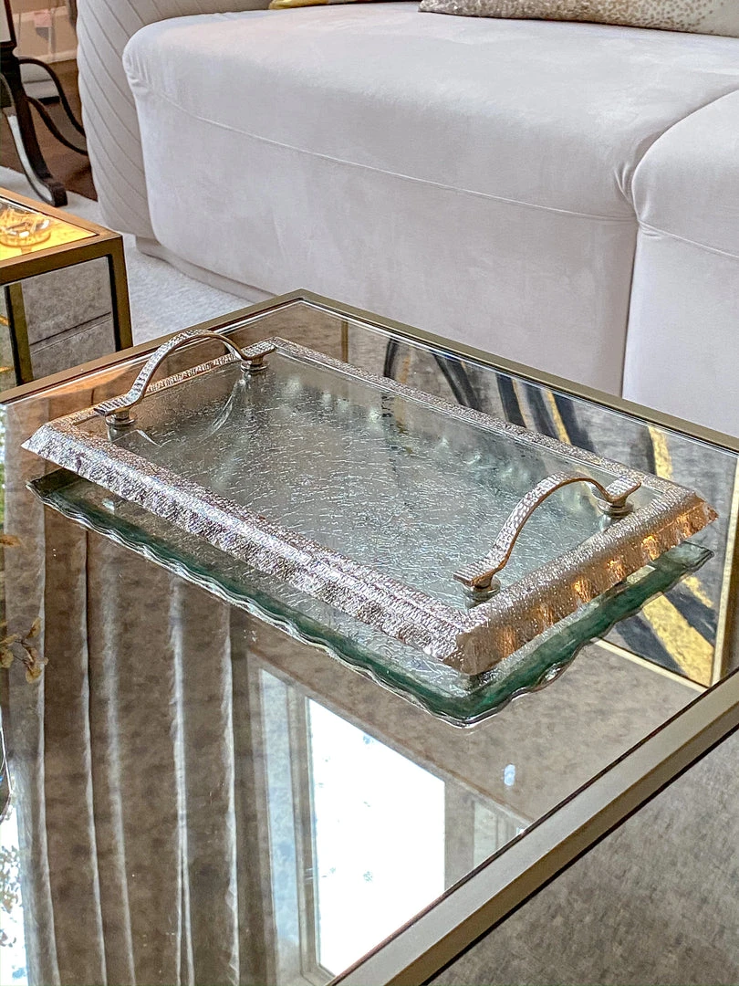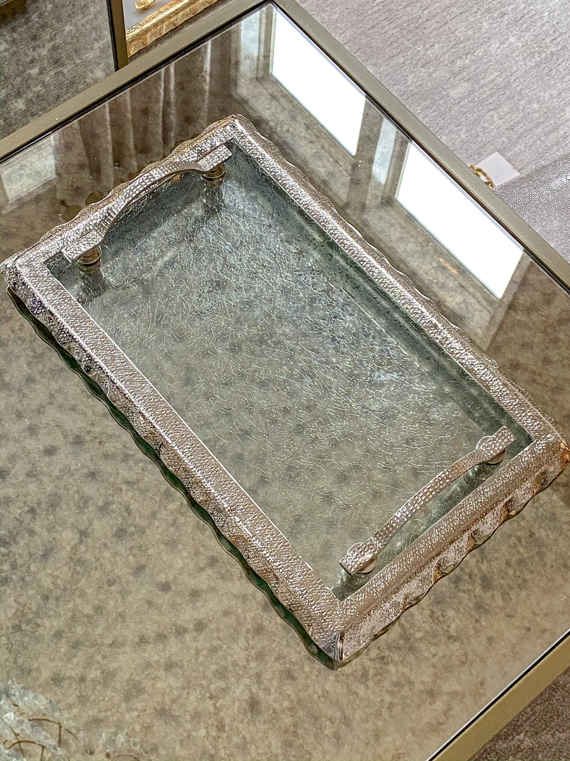 Description: This glass tray features beautiful silver ruffle edging to elegantly display your decor.
