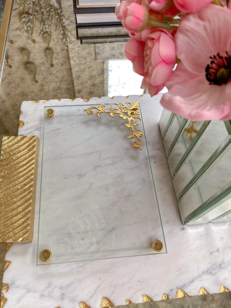 Description: This small and elegant tray is a perfect addition to your home decor! Rectangular glass is accented on the corners by beautiful gold designs that pack so much elegance into a small space!