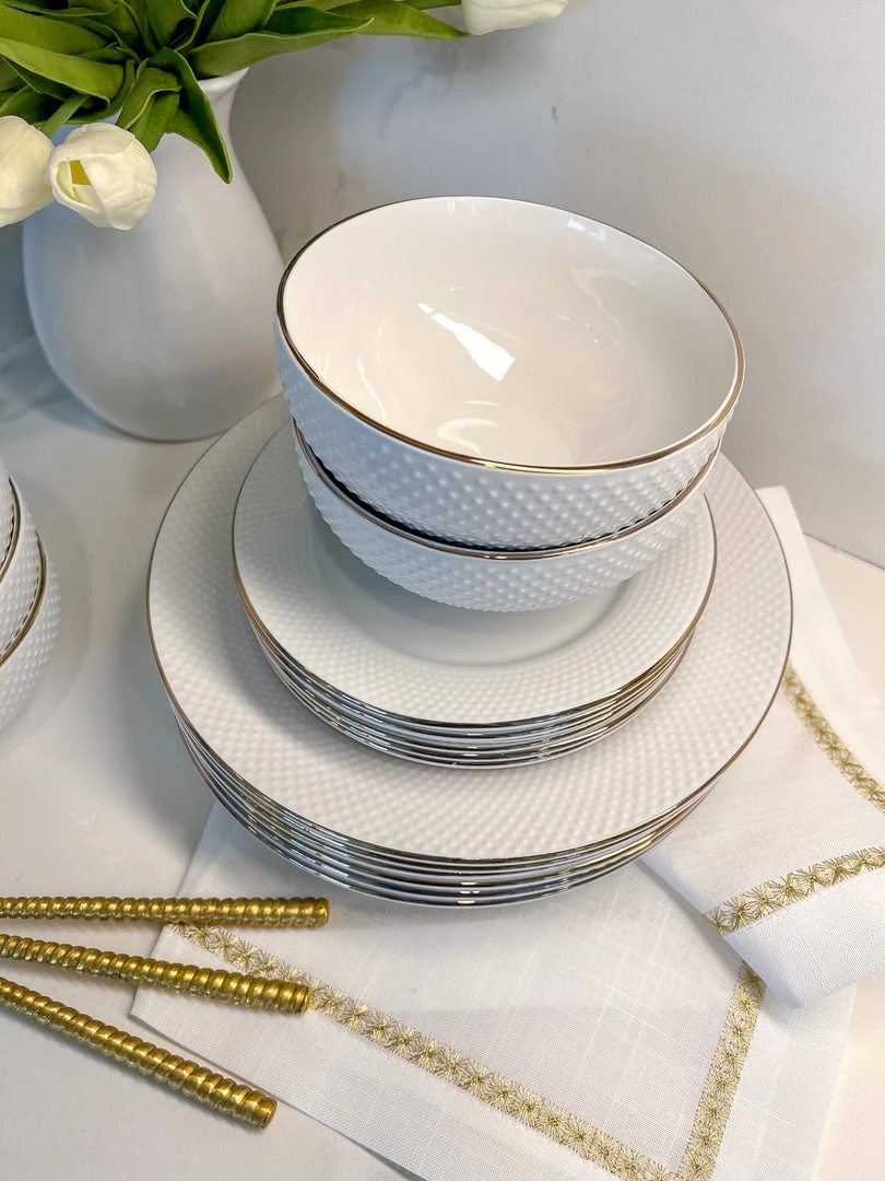Description: This dinner set features a pique criss cross texture with a gold border. It includes 6 sets of dinner plates, salad plates, and soup bowls.