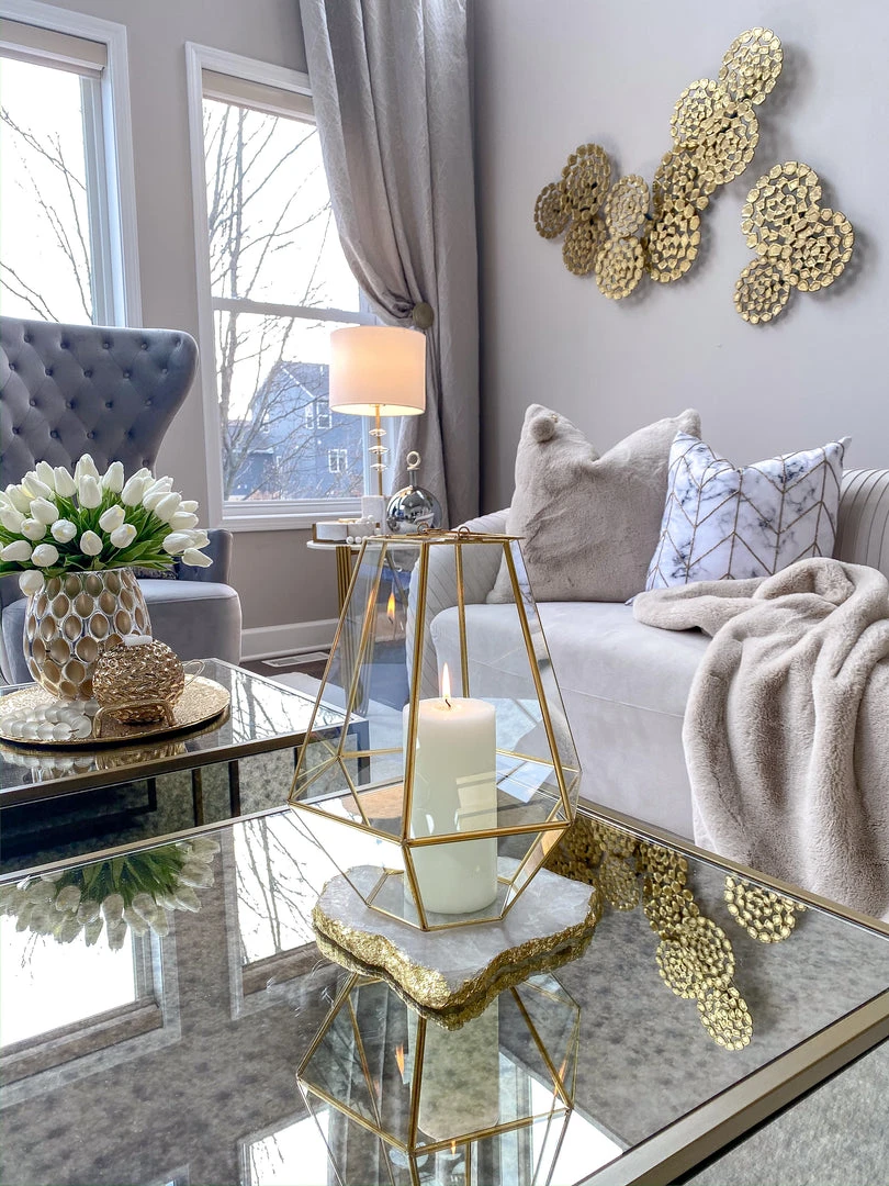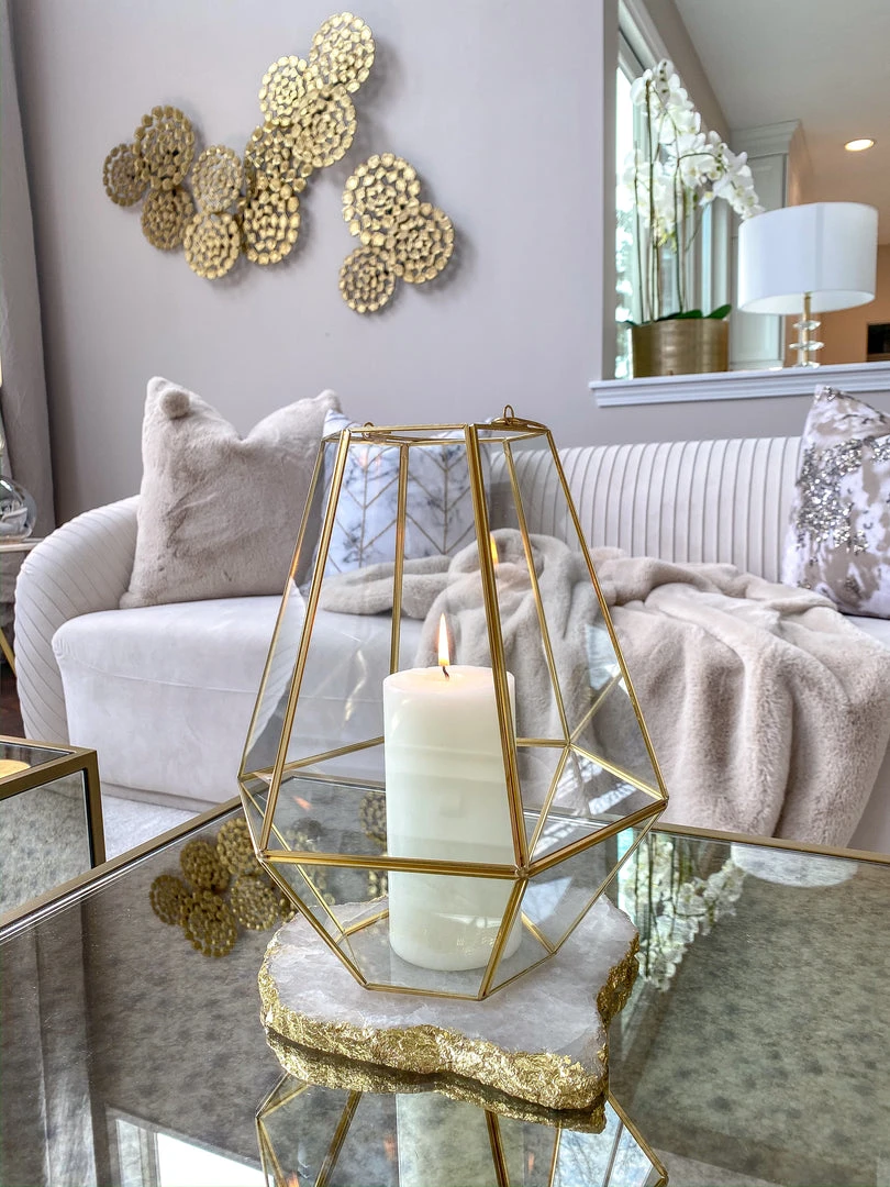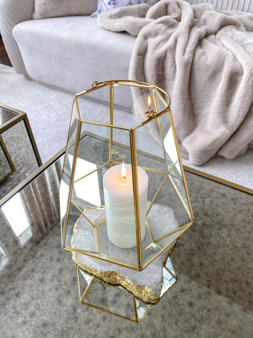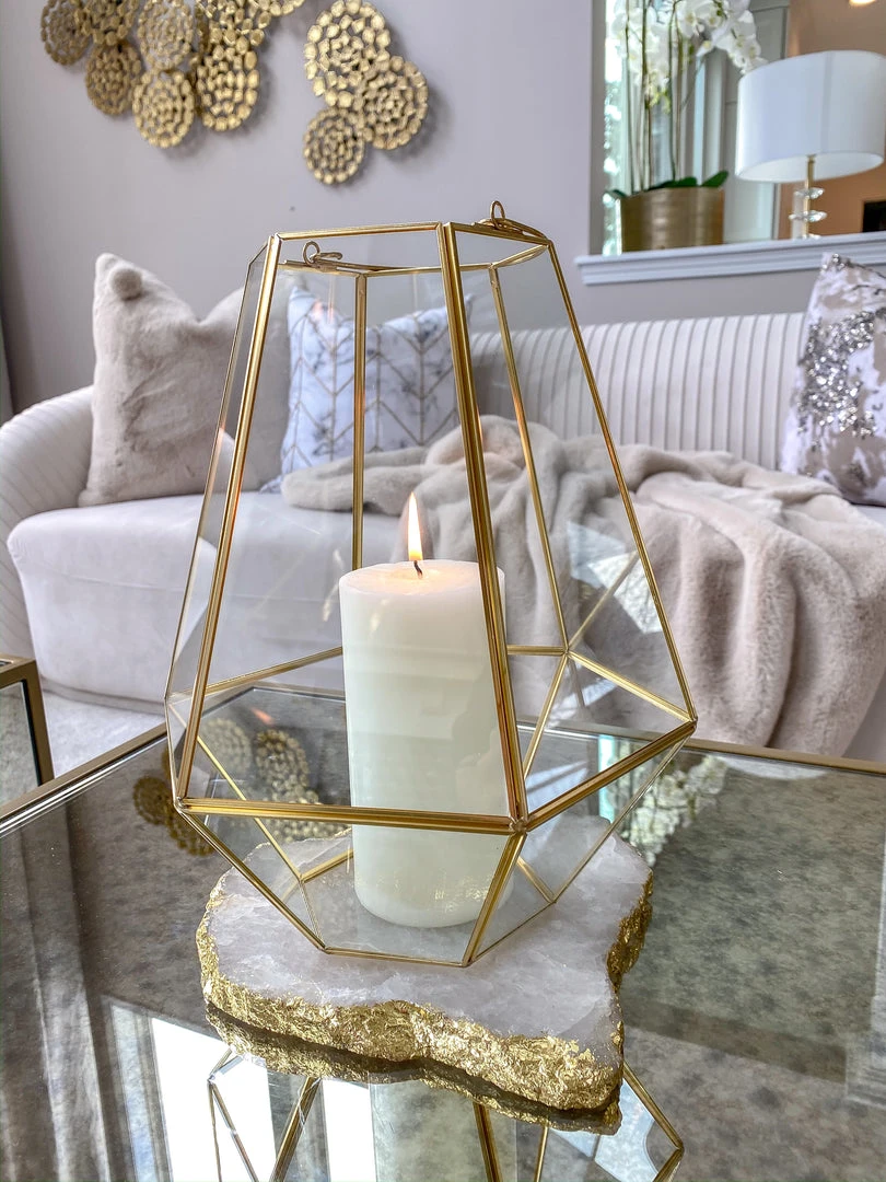 Description: This gold metal and glass lantern features gold metal and is perfect to hold your favorite candle, either real or electric! You could also use this as a vase for your faux florals.