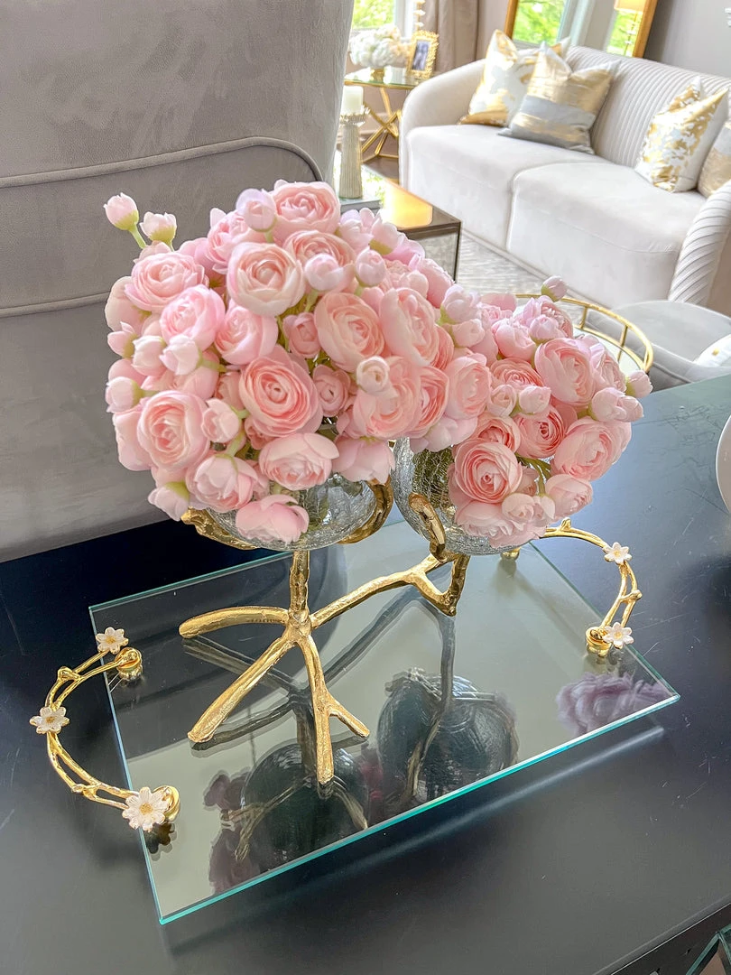 Description: The gold branches cradle two crackled glass bowls which can hold a tealight or votive candles or you can fill them with your favorite faux floral.