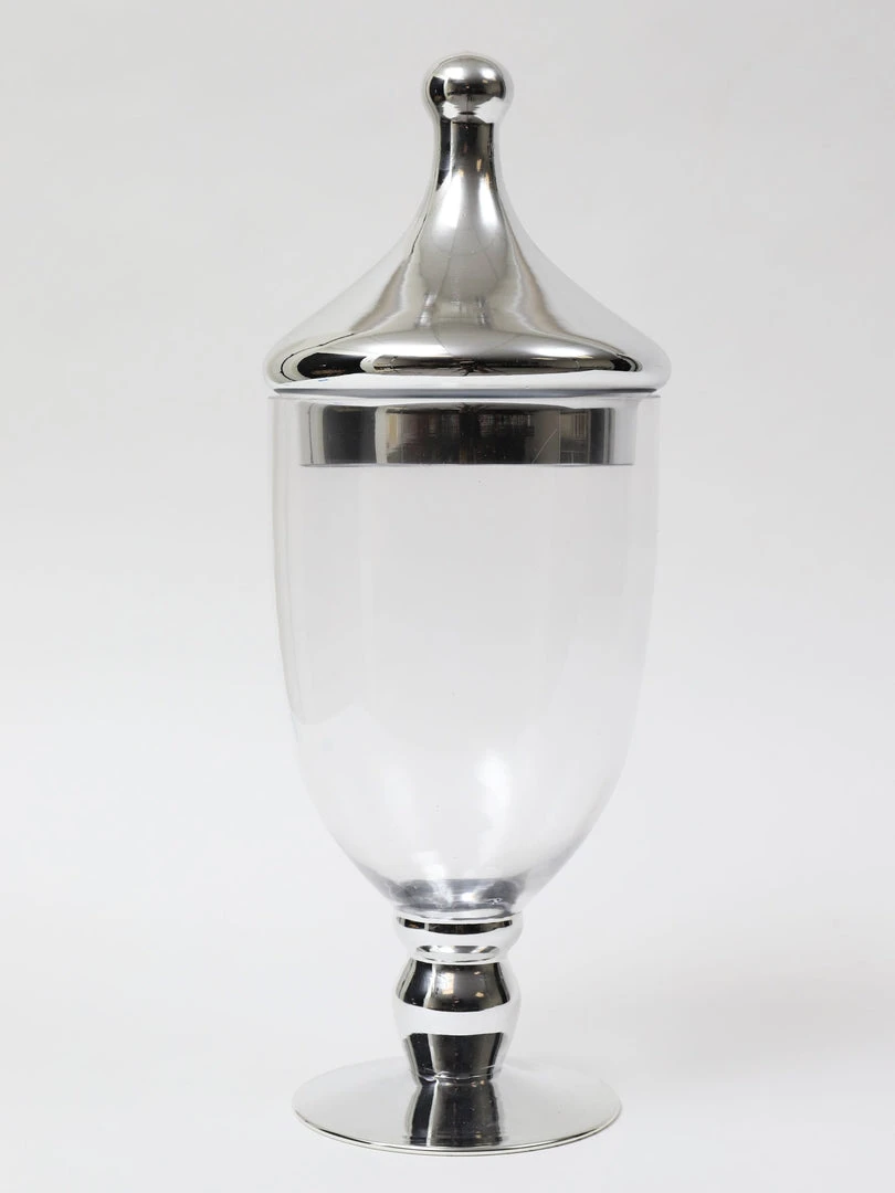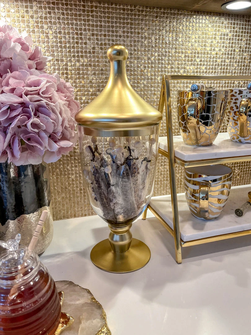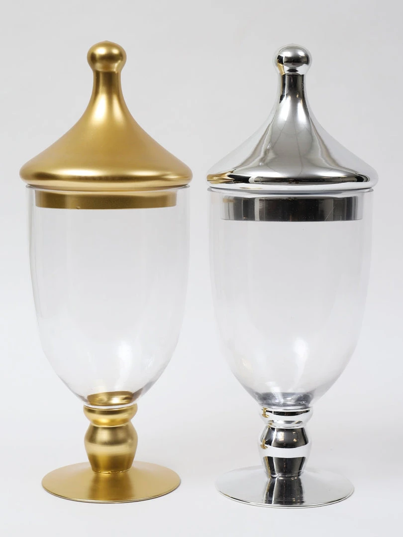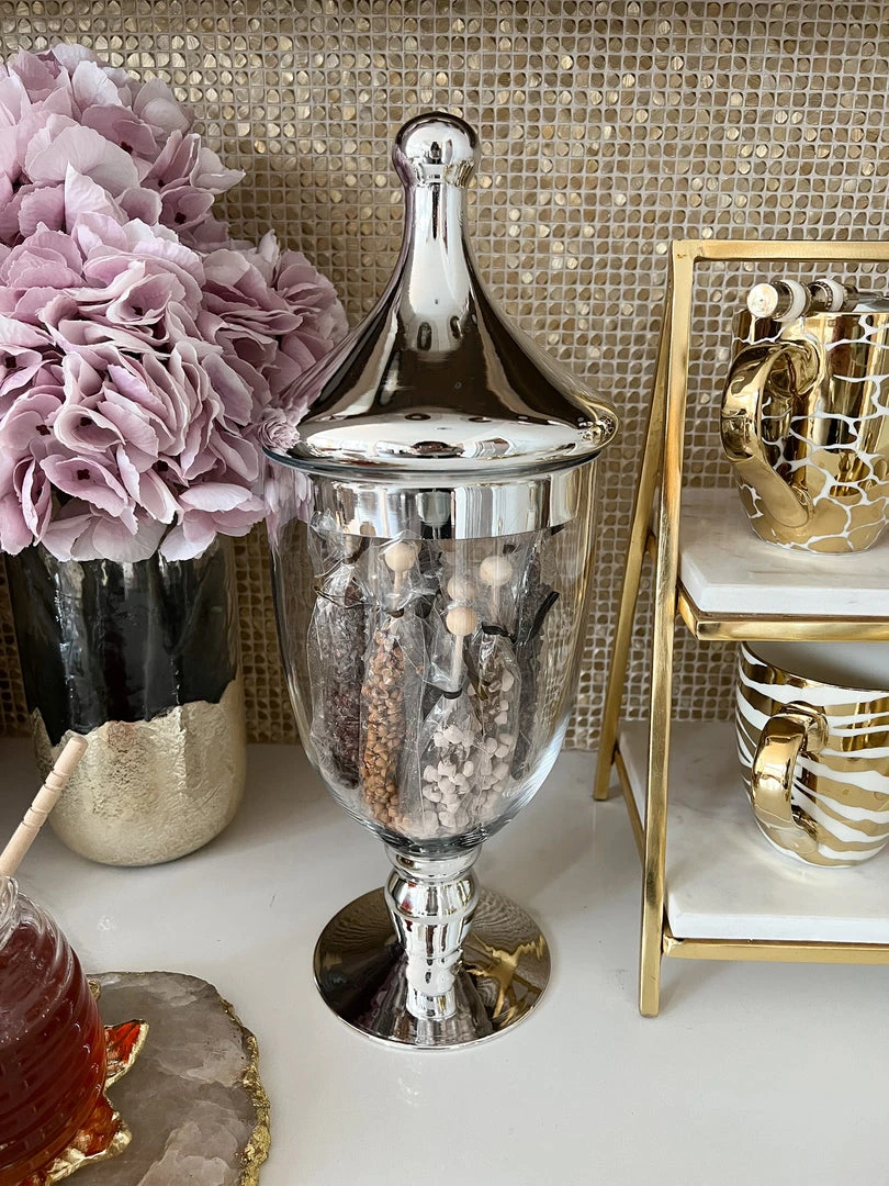 Description: These glass apothecary jars have a fun and interesting shape and are perfect to hold things or as a vase!
