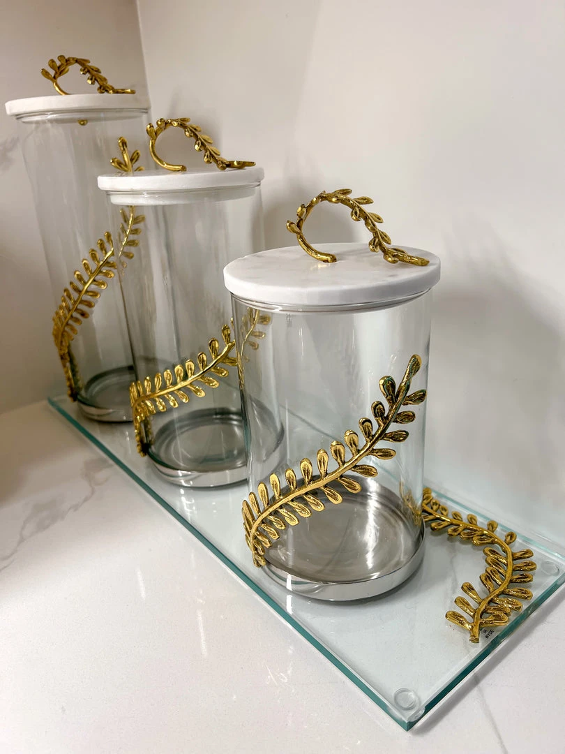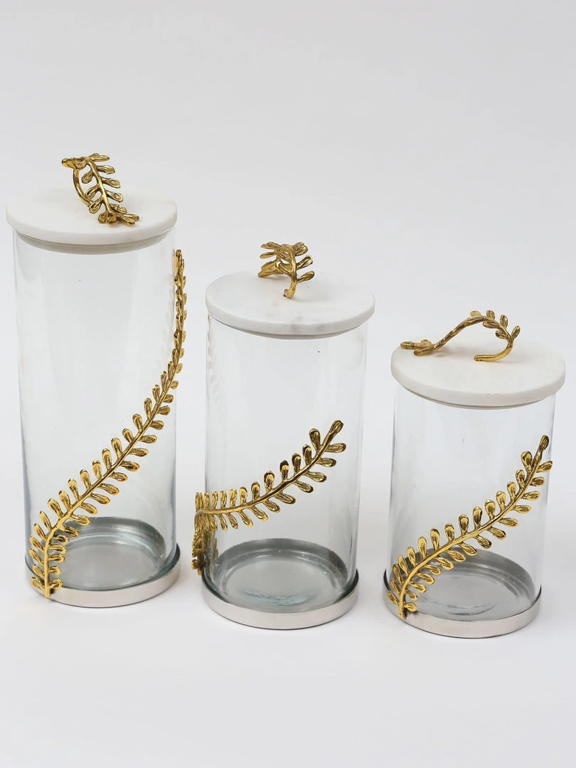 Description: This glass canister with a marble and curry leaf lid is just what you were looking for! Enhance your display with these canisters.