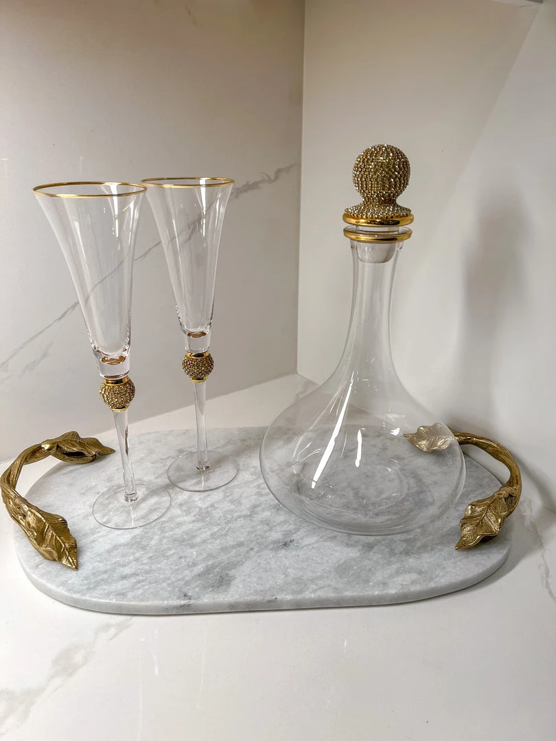 Description: Adorn your table with this sophisticated decanter which is crowned with a circular crystal gold stopper.