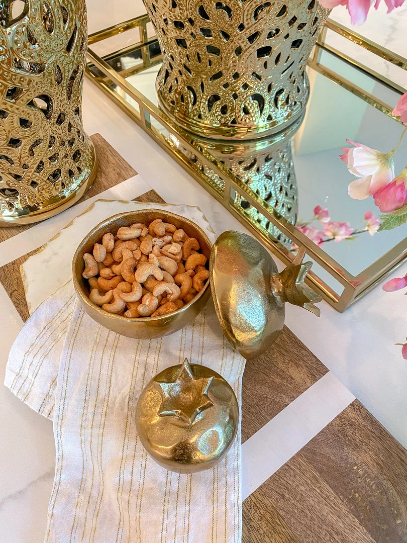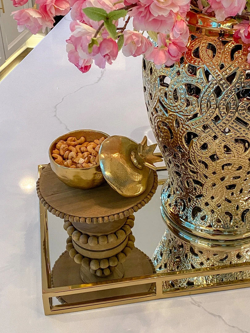 Description: This beautiful golden fruit serving dish is absolutely stunning! We love the silhouette of these piece and it will look perfect on your vignette! Available in 2 sizes.