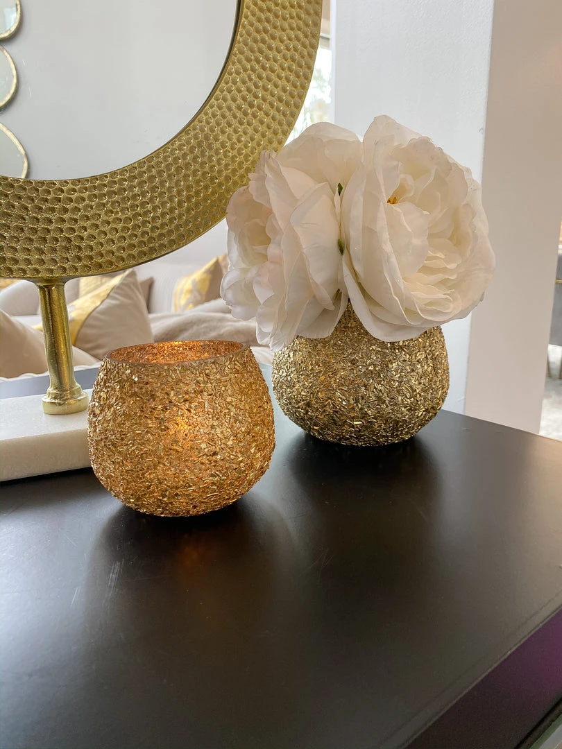 Description: This beautiful gold jeweled votive is a perfect little fixture for your favorite candles and accessories! The luxurious gold finish is created with a thick coating of beautiful glass jewels and offers the epitomy of elegance! Available in 2 sizes!