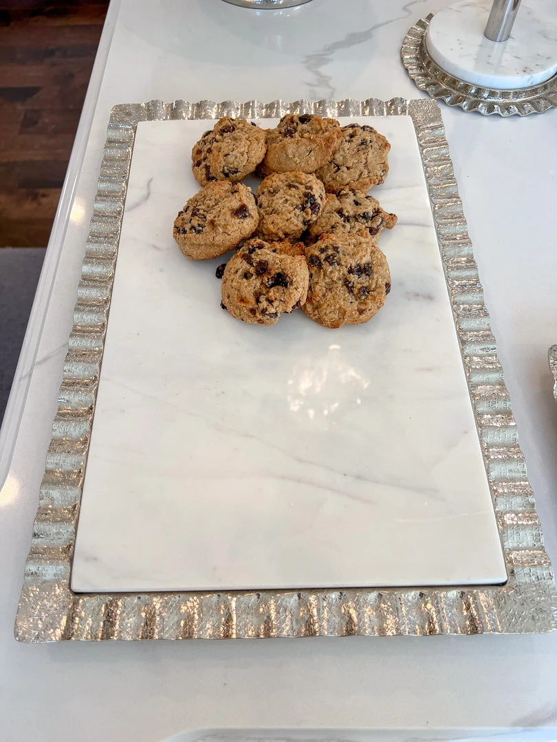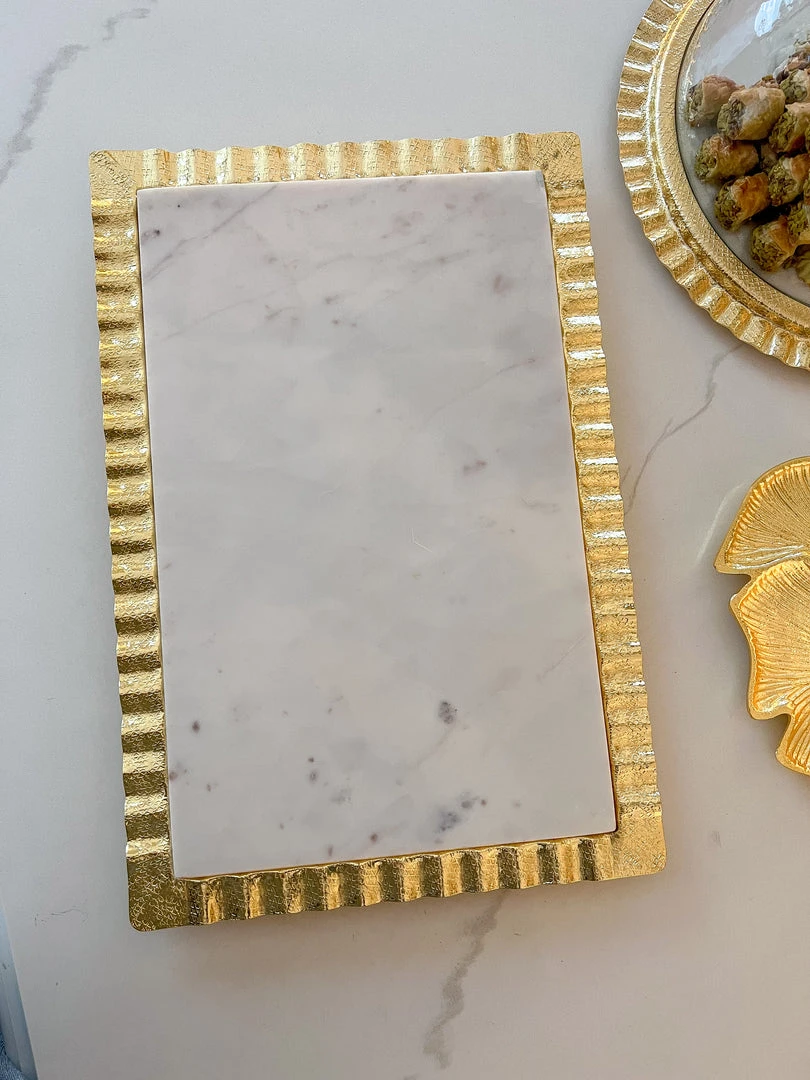 Description: This large beautiful marble tray features beautiful rippled edges. Use it to style your decor or your coffee station elegantly!