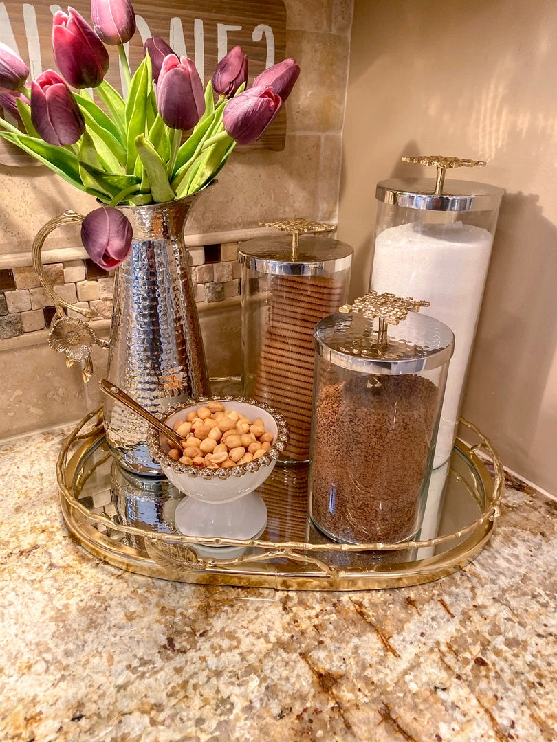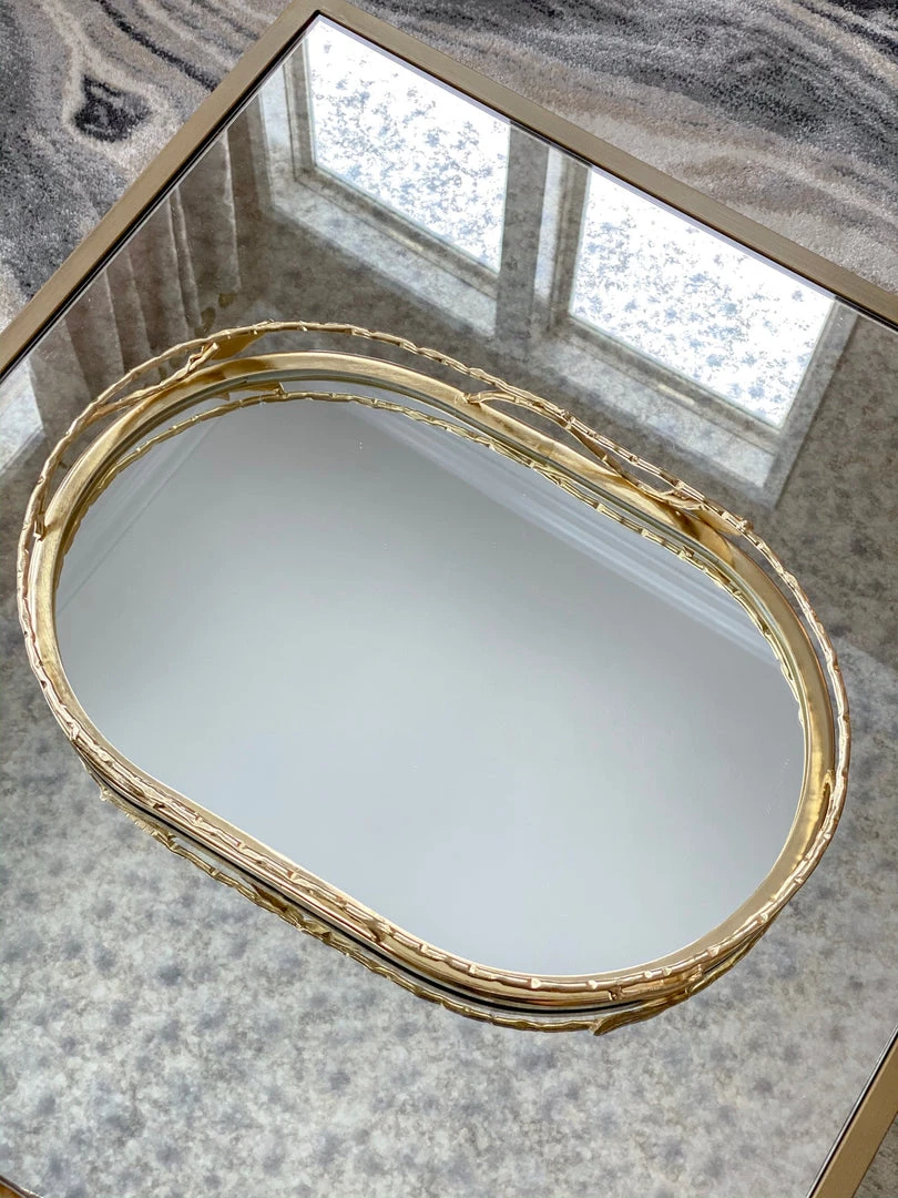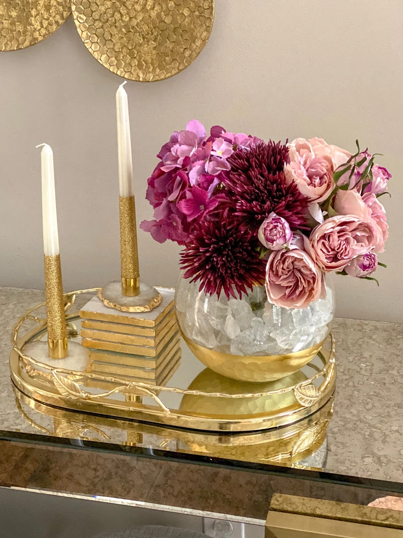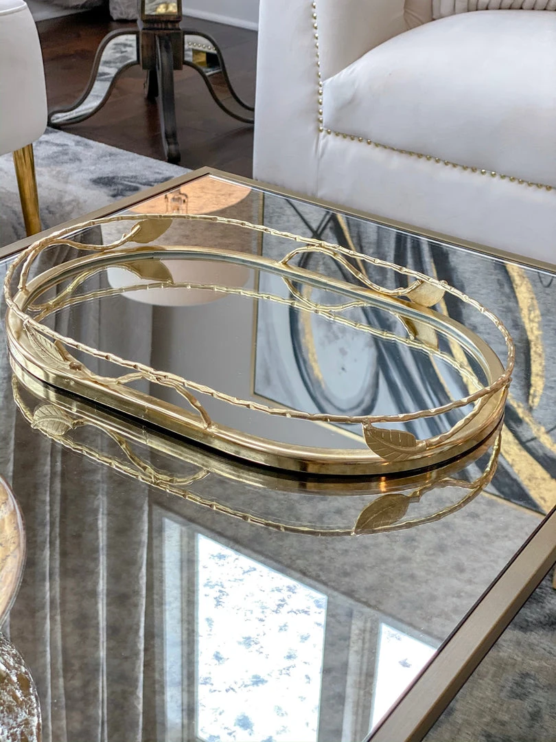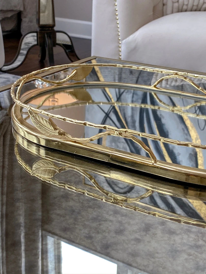 Simple yet fancy mirrored tray with gold leaf accents for a glamorous touch!