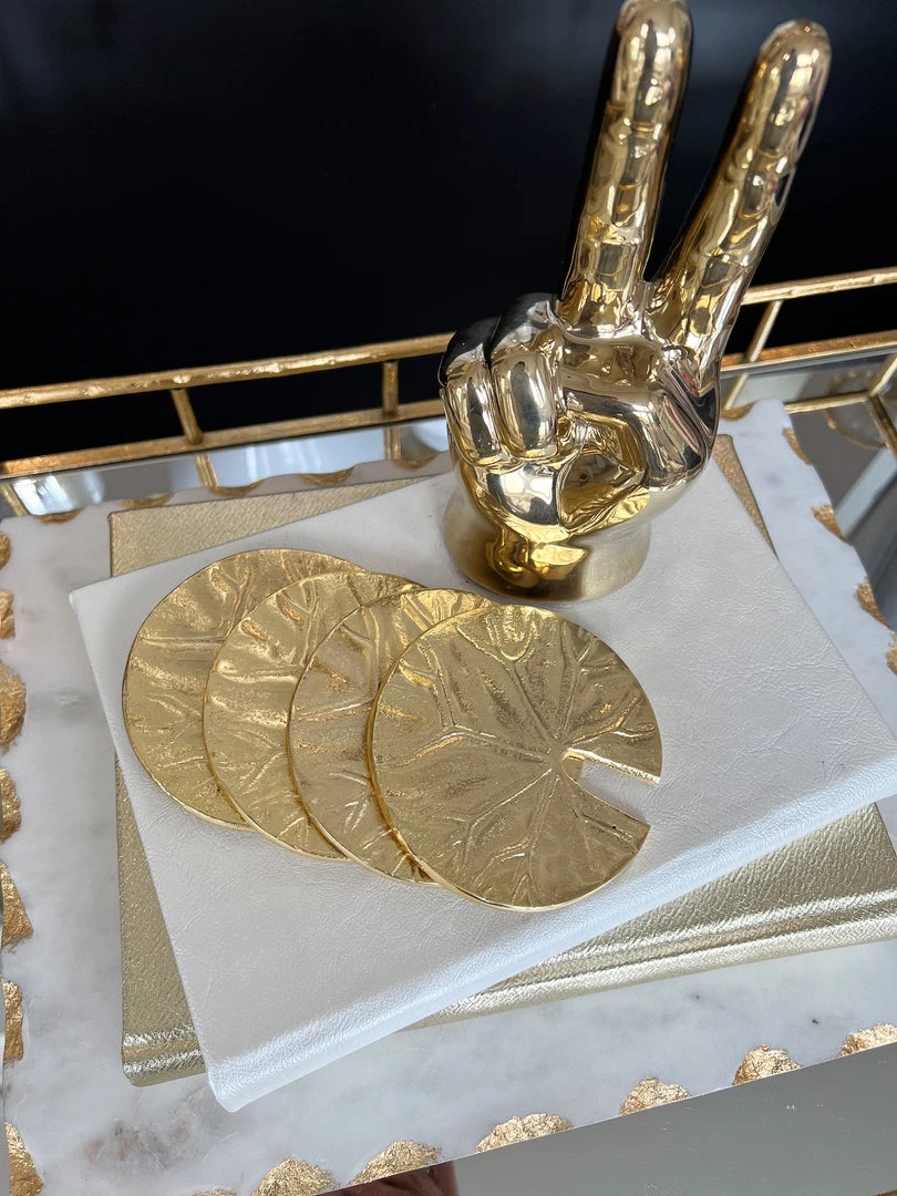 Description: This gold decorative peace sign is perfect for a shelf, desk, or coffee table! We love the quirky design with the glam finish!