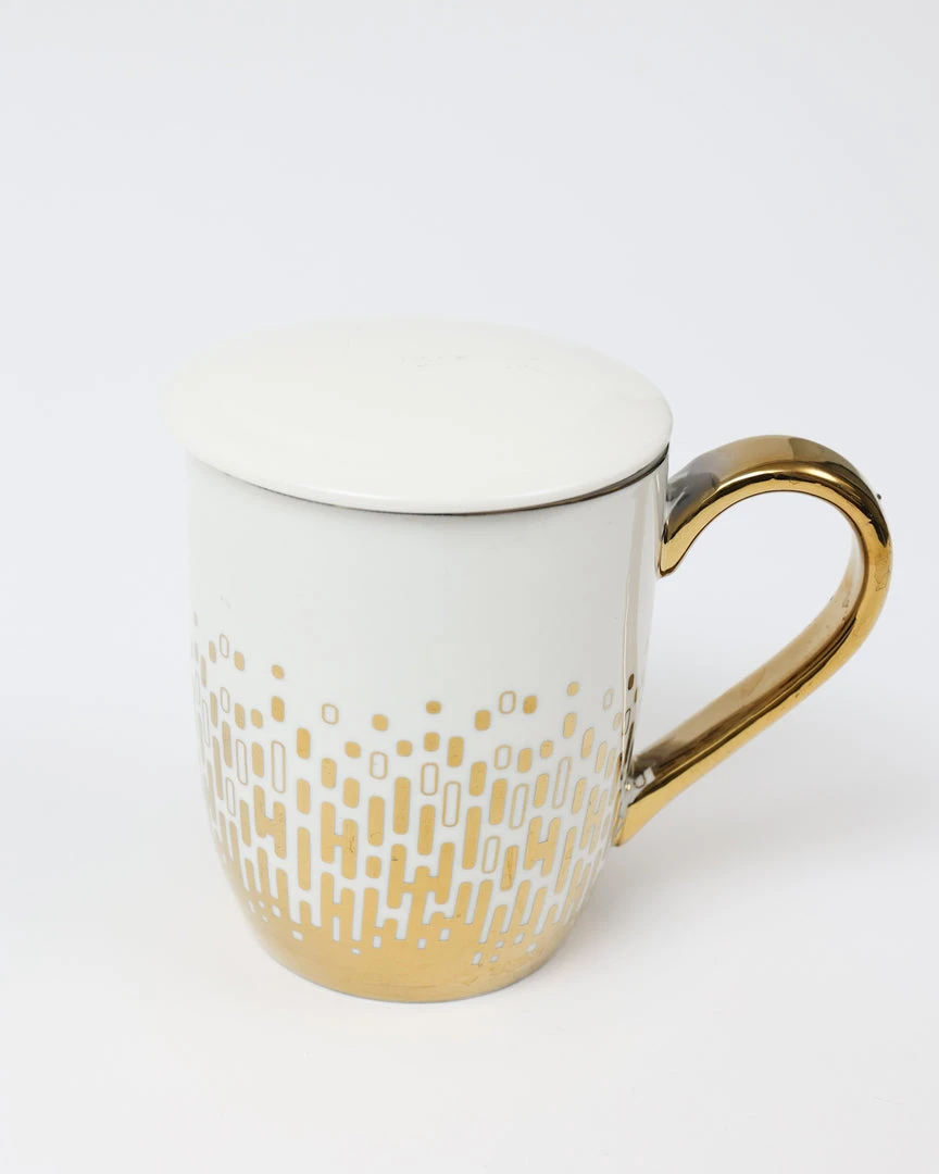 Description: This is one gorgeous gold and white mug with a ceramic lid to keep your coffee or tea warm as can be!