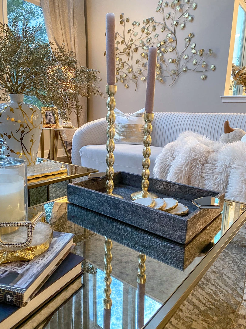 Description: These dazzling detailed trays offer a unique and modern design style! We love the bold abstract handles, complimented with the faux grey leather finish!