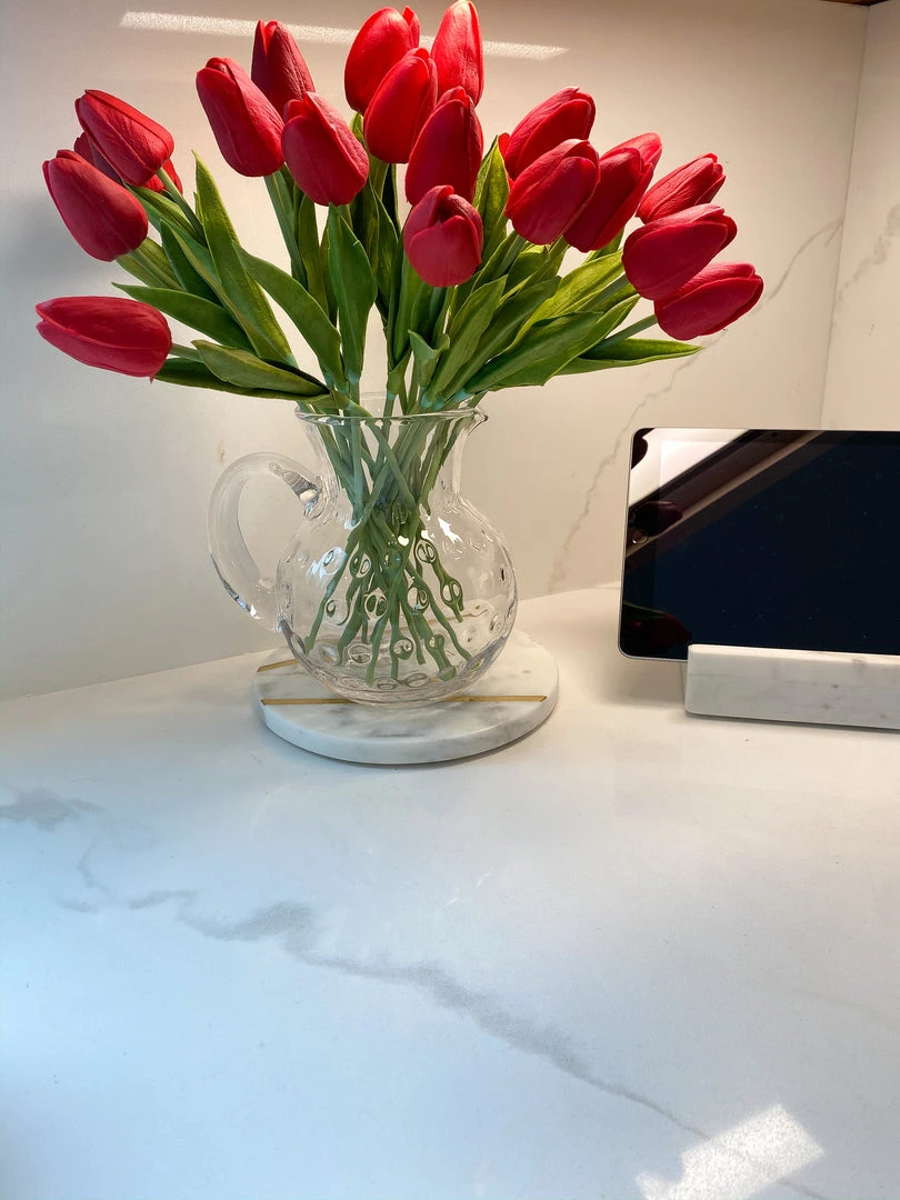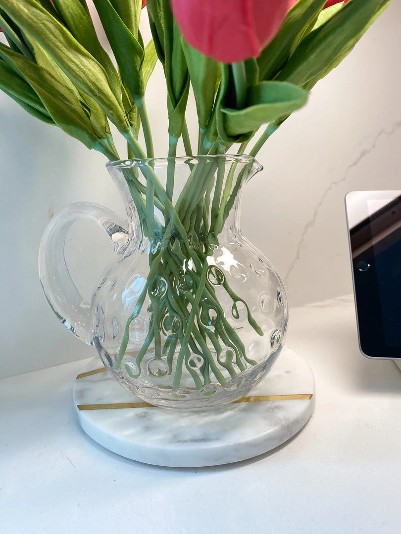 This clear glass pitcher is indented and is here just in time for spring! Fill with your favorite beverage and use to serve your guests on a sunny day!