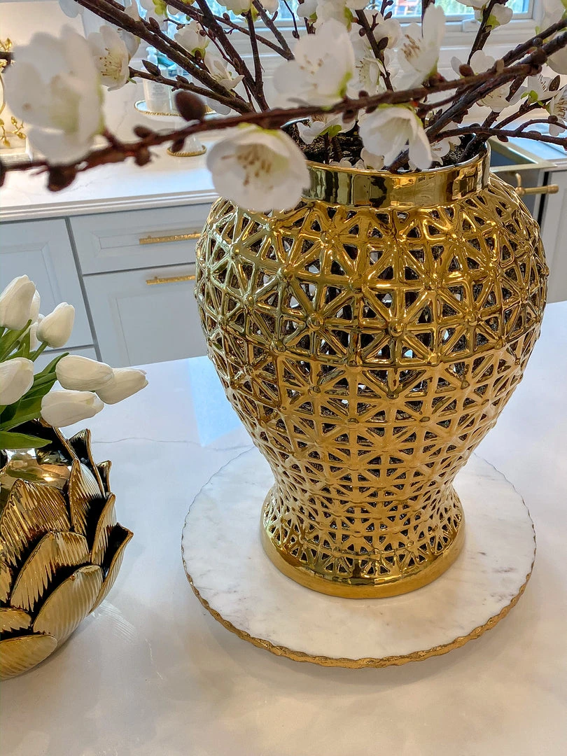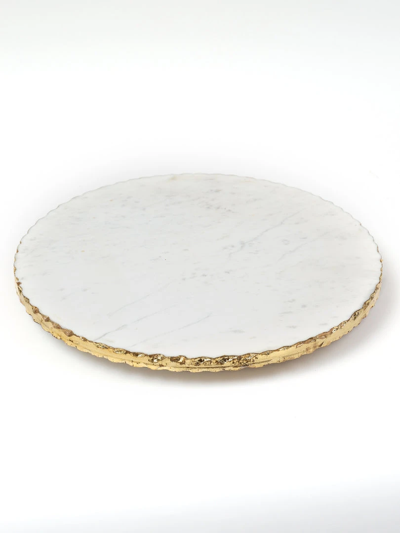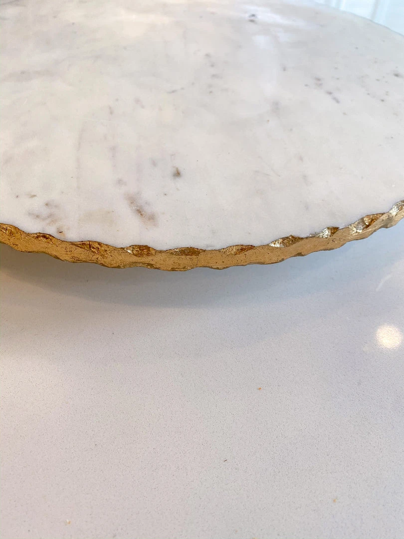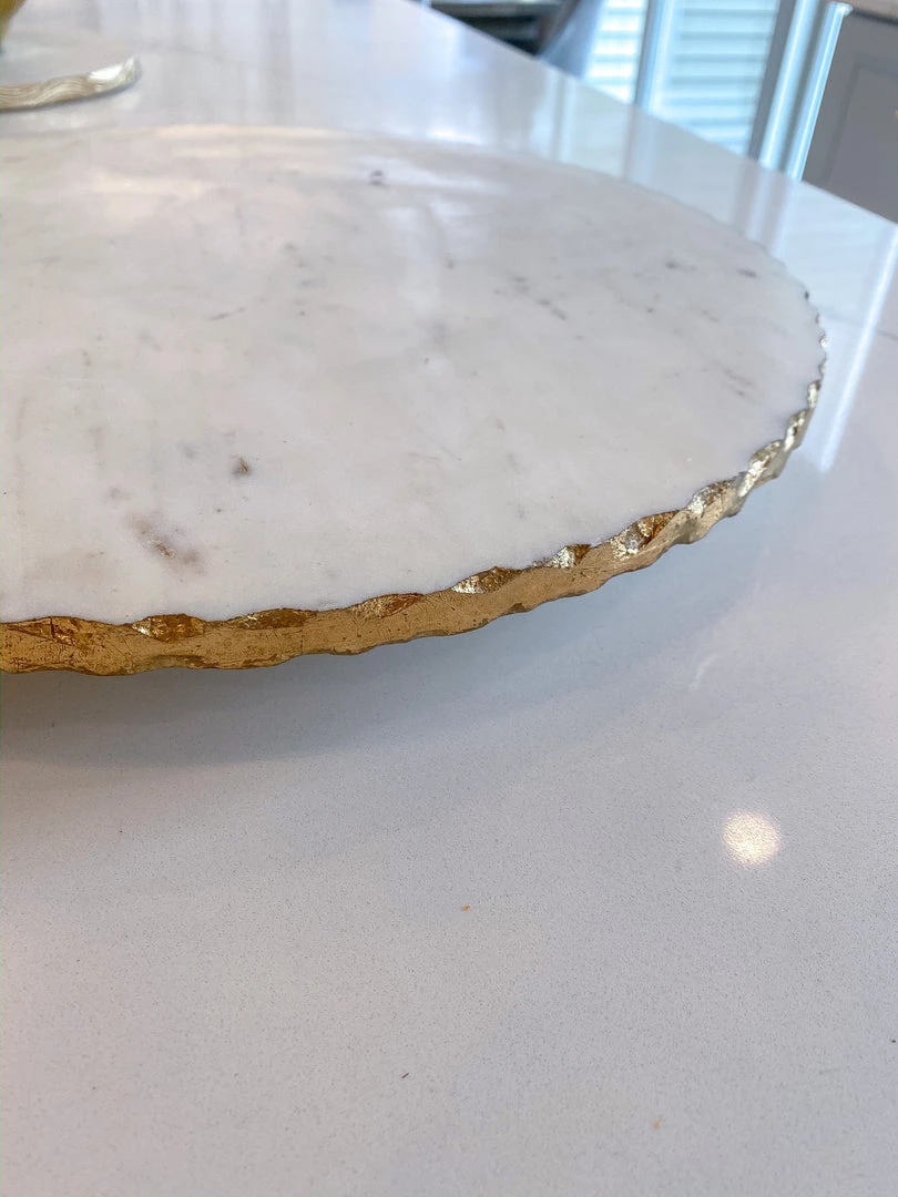 Description: This marble lazy Susan is very significant and features a stunning metallic gold edge. It is 16″ in diameter and is very large. This piece is perfect for your kitchen island or counters!