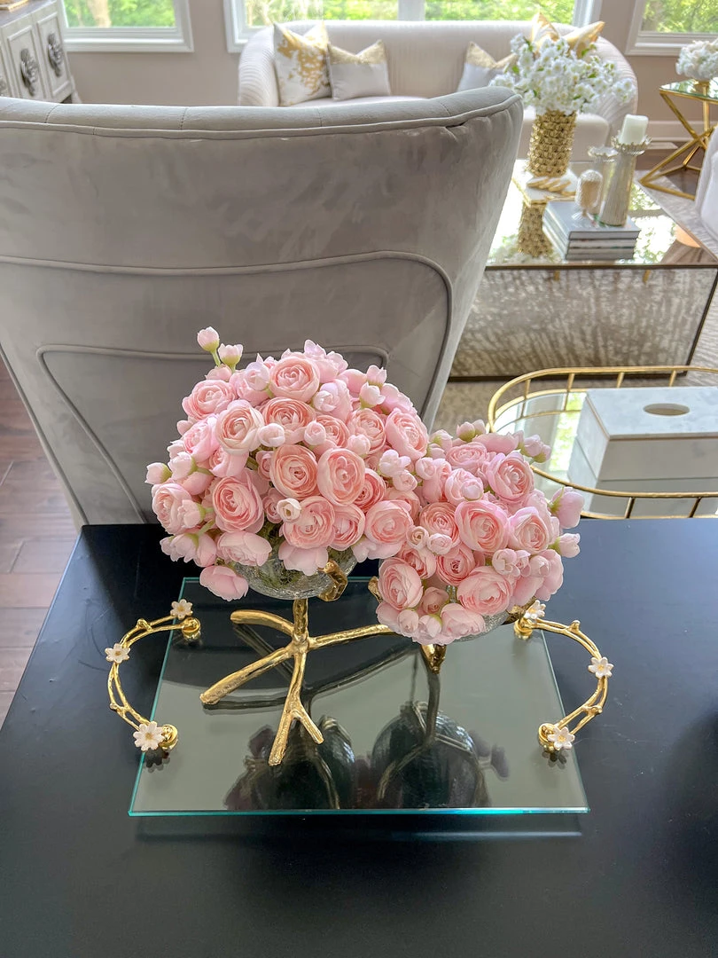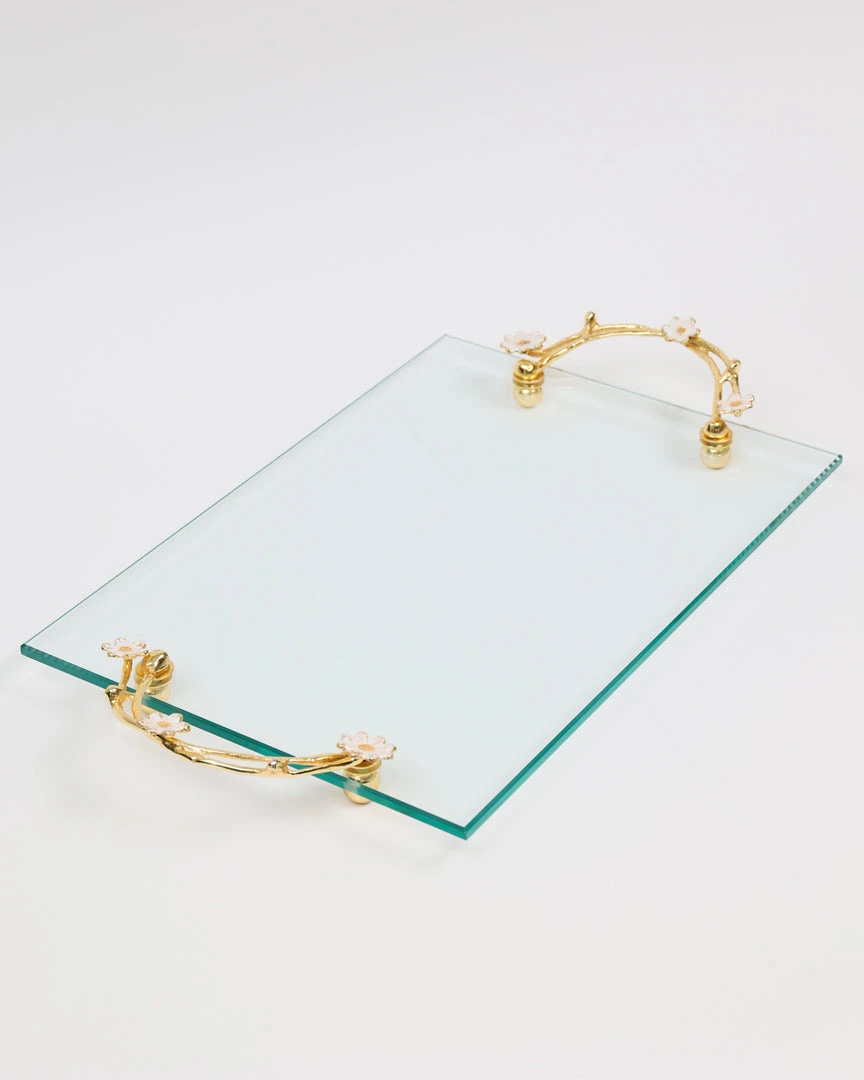 Description: This large rectangular glass tray has stunning gold detail and gold handles with a cherry blossom design!
