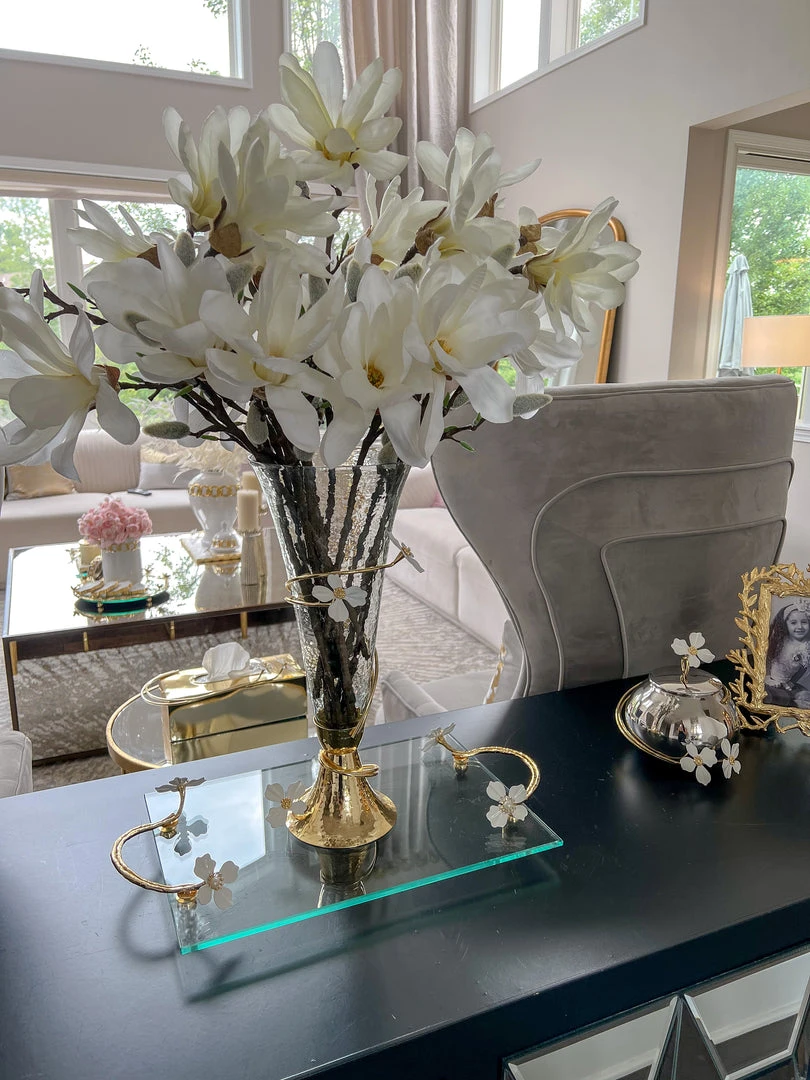 Description: This beautiful rectangular glass tray has stunning gold details with a white jeweled flower design!