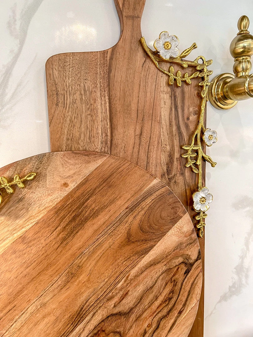 Description: This beautiful Charcuterie Board has a stunning Cherry Blossom design and will make a gorgeous serving display! Stand it up and layer it with other boards!