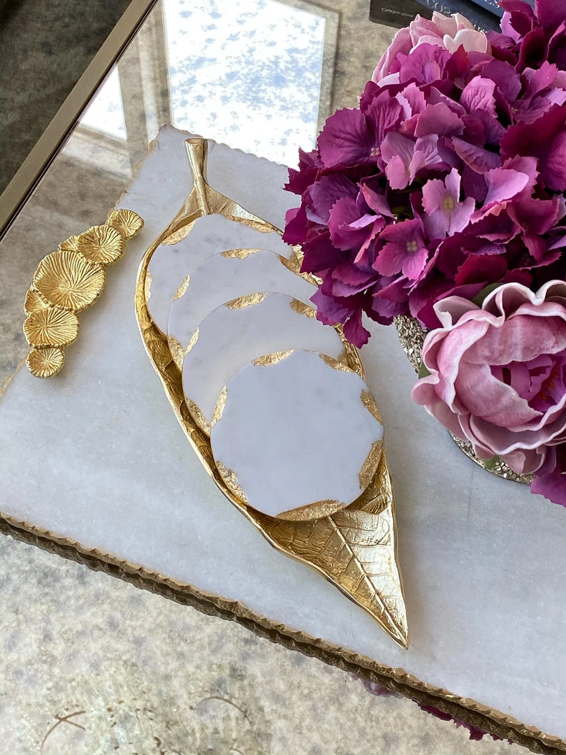 Description: A beautiful gold leaf tray perfect for displaying any of our coasters!