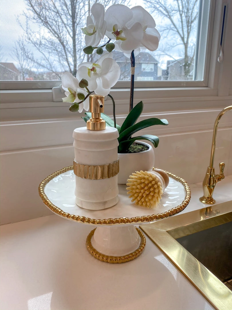Description: This marble soap dispenser features a gold patterned stripe that is stunning. This will take your kitchen or bathroom to the next level!