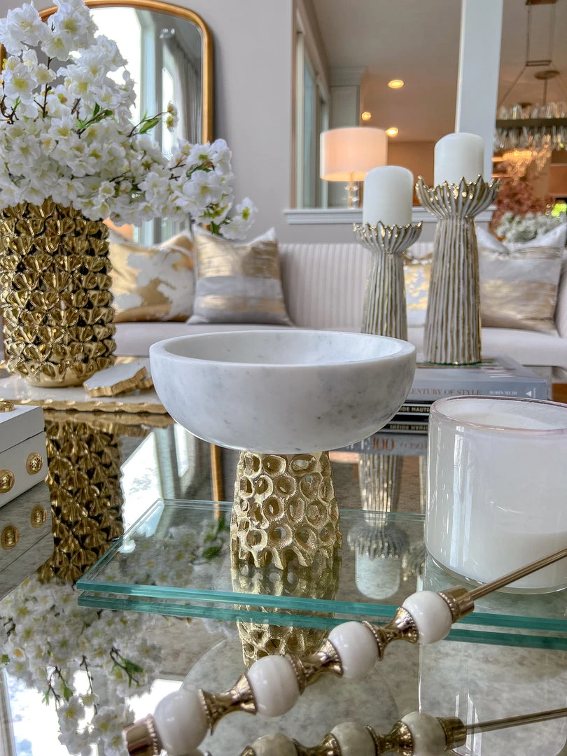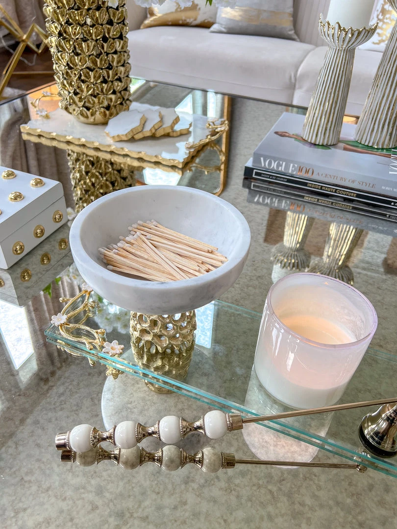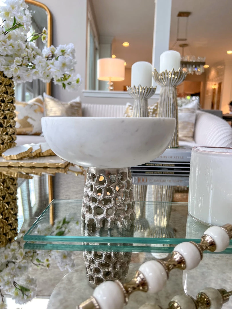 Description: This smaller-sized marble bowl with an intricate cutout design base will be perfect for serving snacks, as a match holder or placing your favorite smaller florals in!