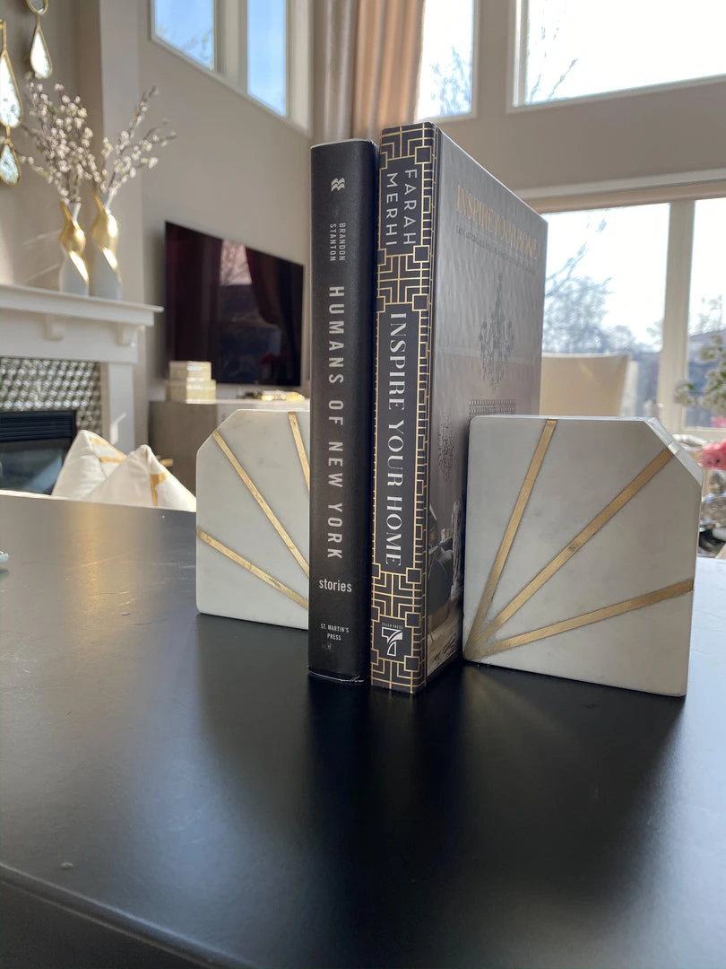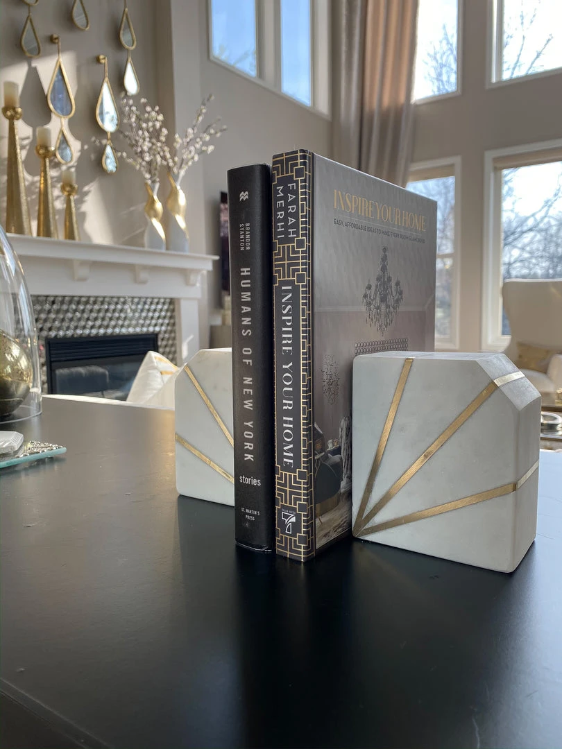 Description: Add some flair to your shelving with these stylist marble bookends! The white marble features geometric designs that add to the modern look, while still keeping it classic and elegant.
