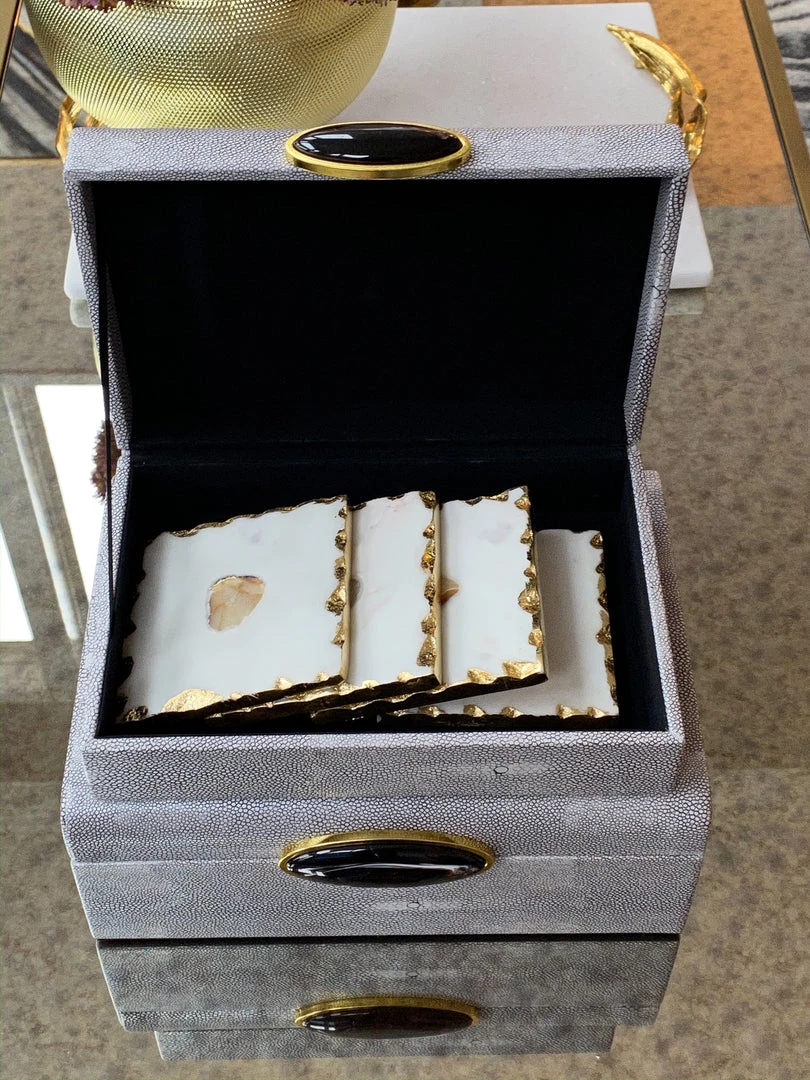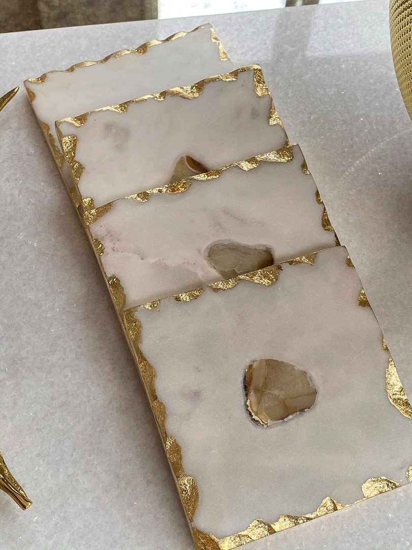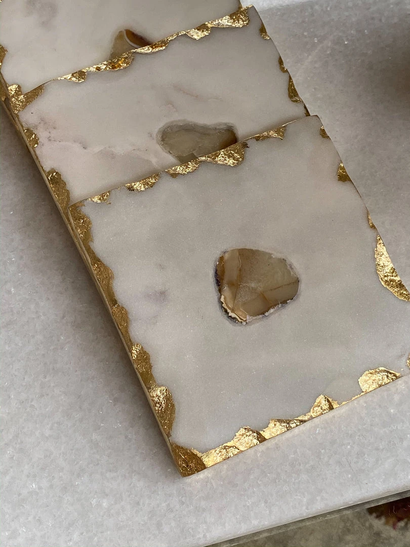 This set of 4 coasters feature an elegant gold detailed edge and an intricate agate center. Perfect to display on a tray or to use with your favorite glass.