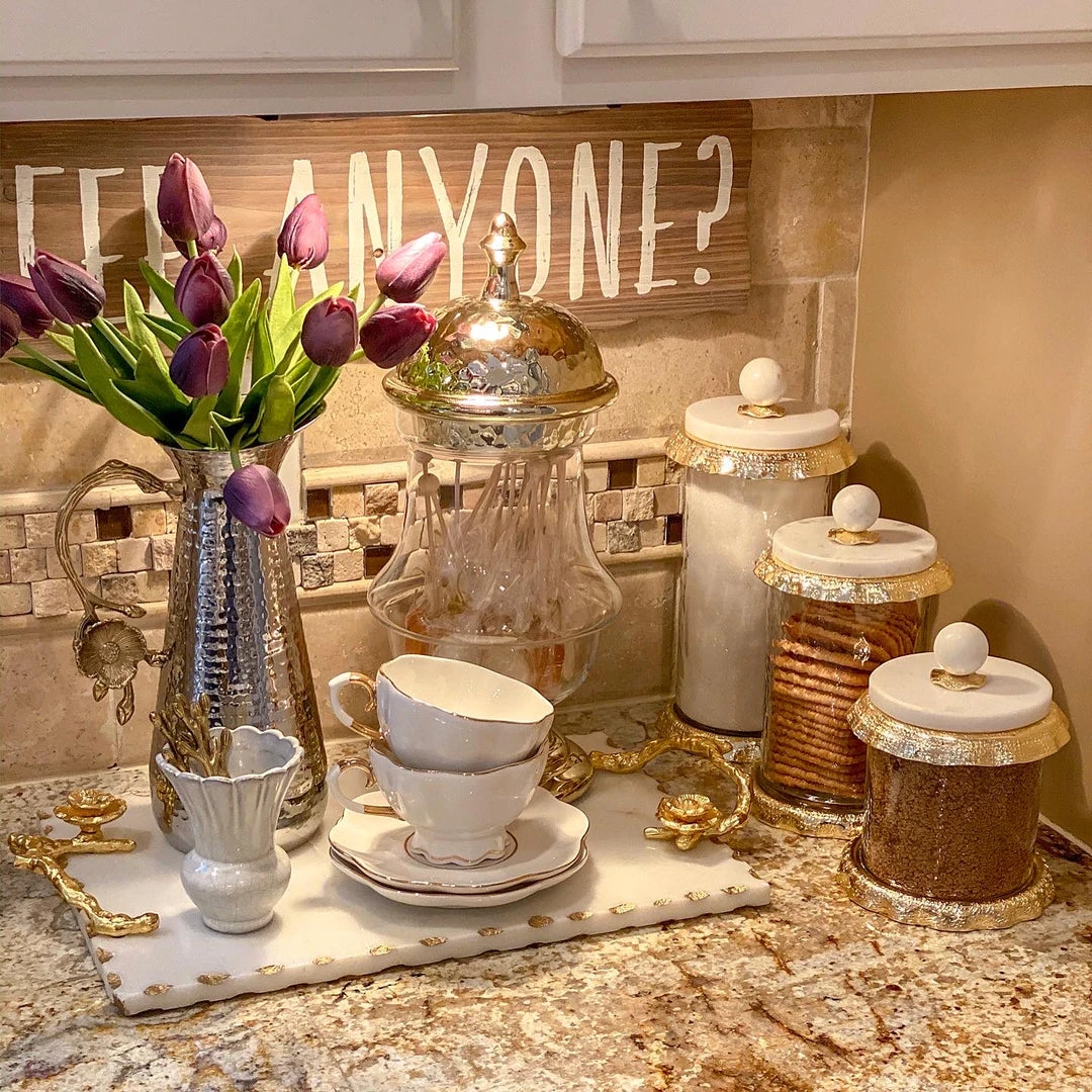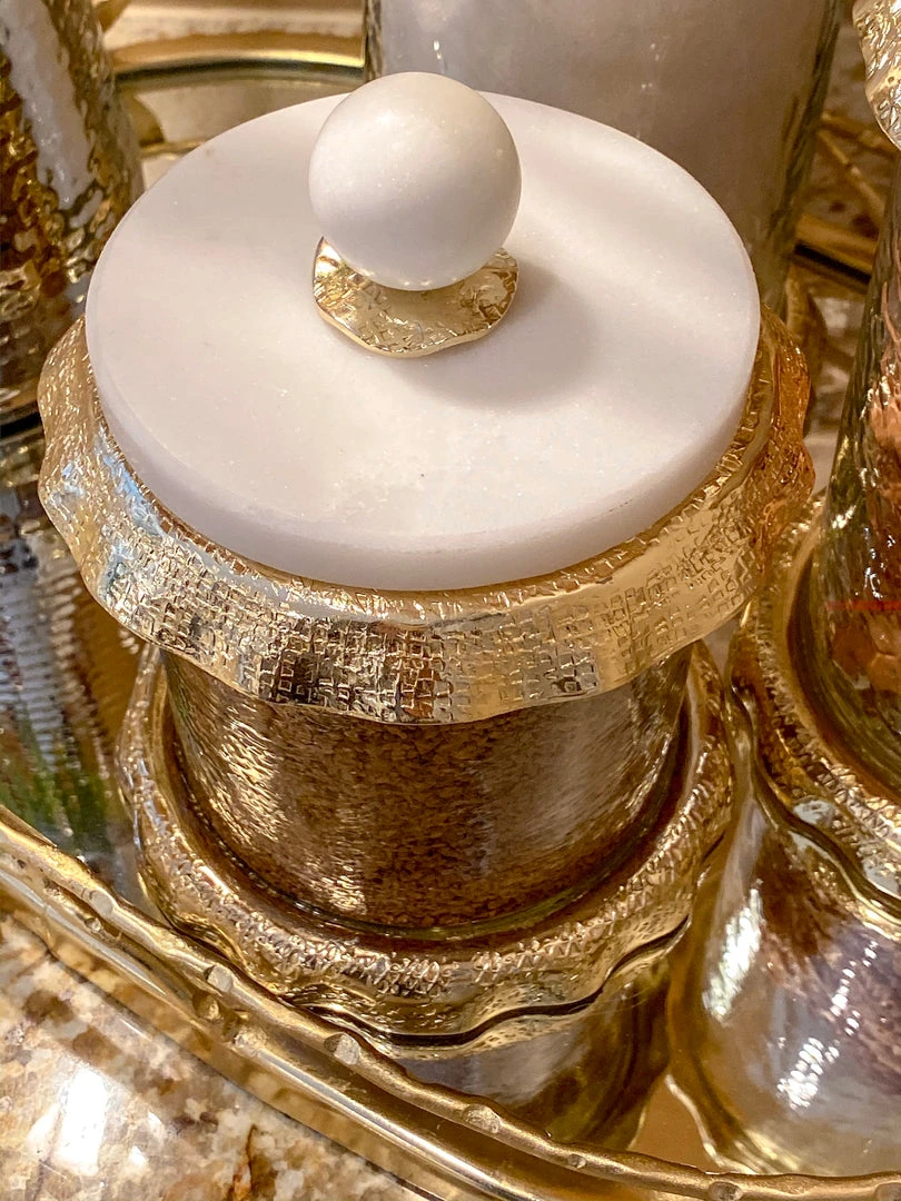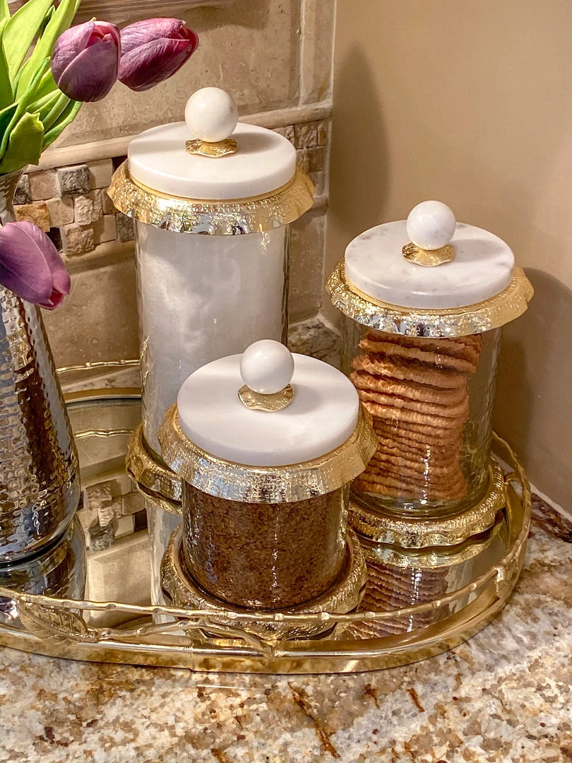 Beautiful glass container with real marble lid great for storing snacks, treats and anything that fits in the variety of three sizes!