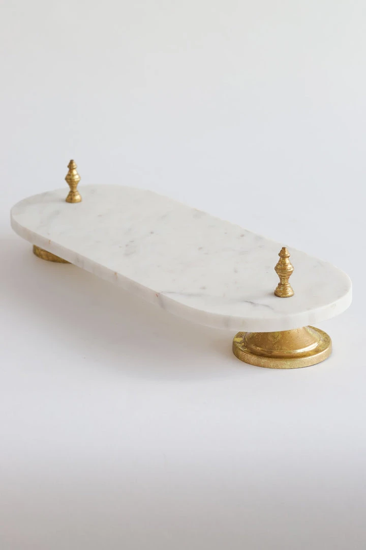 Description: This marble pedestal tray is a beautiful accent piece for your tabletop decor! The oblong marble rests on rounnd legs with an antique gold finish. Classic luxury!
