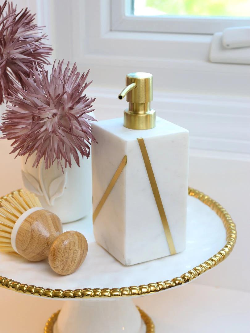 Description: This marble soap dispenser features a gold line stripe detail is stunning. This will take your kitchen or bathroom to the next level!