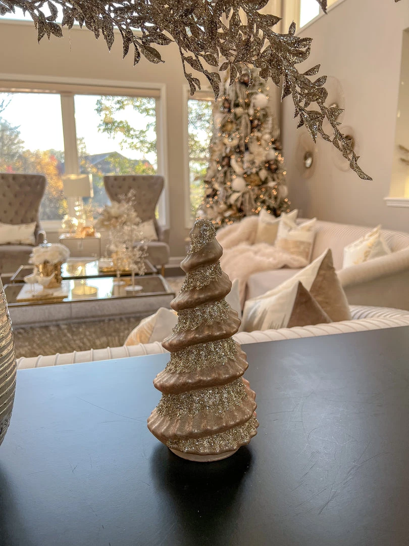 Description: This mercury glass tree with its neutral silver and gold coloring and beautiful glitter finish will instantly elevate any table or shelf as it shimmers in the light effortlessly.