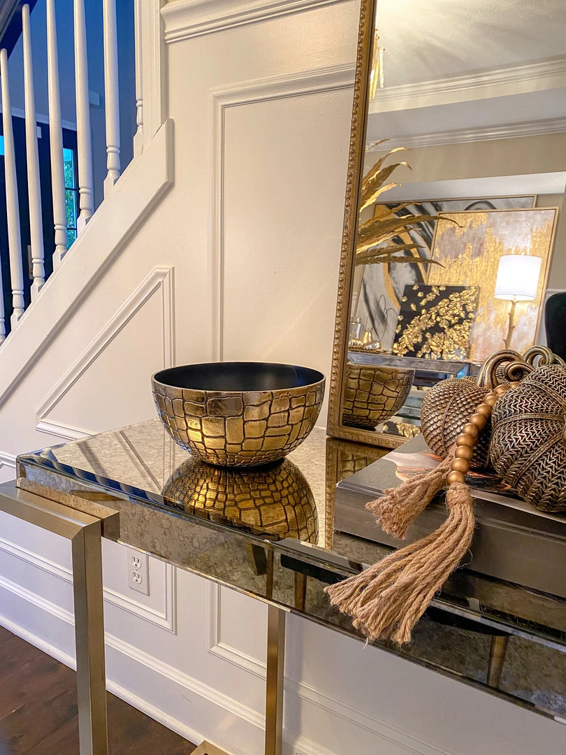 Description: The unique crocodile texture of this gold bowl stands out from traditional houseware. Pair this with other items from this collection for a complete look.
