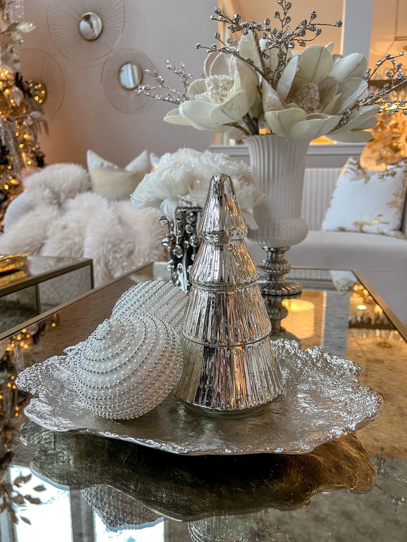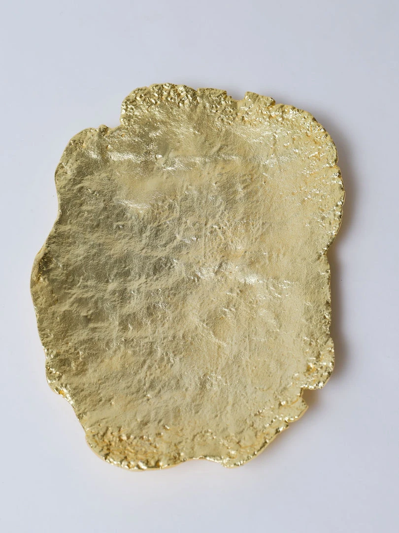 Description: Style your favorite vase, candles or decor on this gorgeous textured rough edge tray for a beautiful vignette. Available in gold and silver.